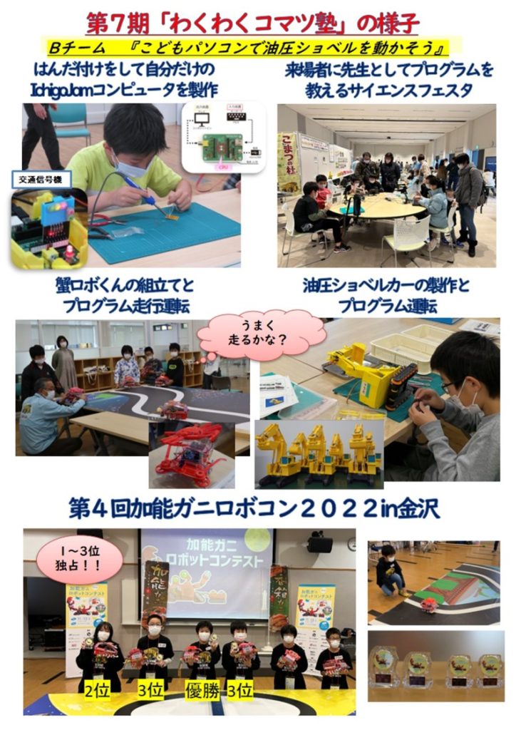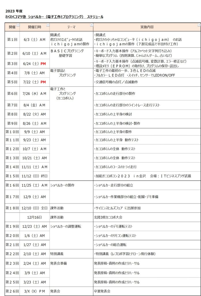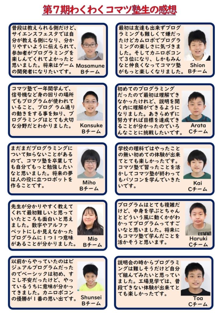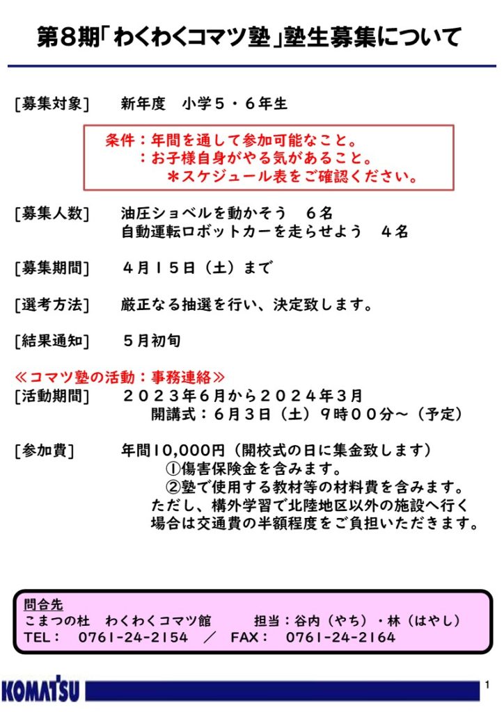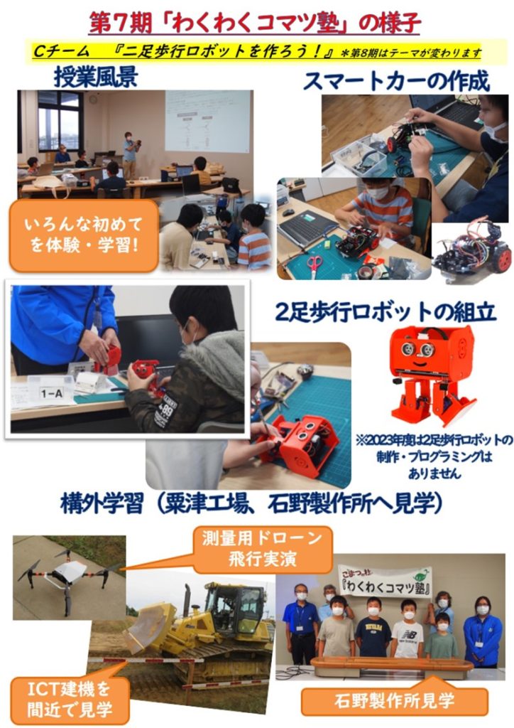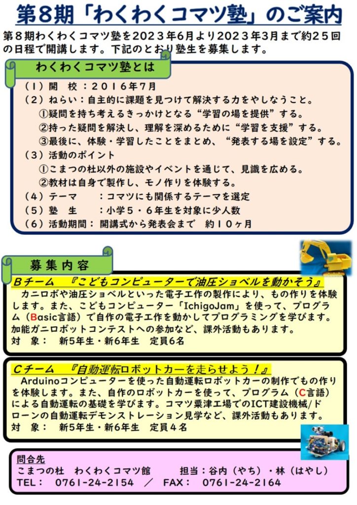2023年6月から2024年3月までの期間、「自主的に課題を見つけて解決する力を養うこと」をねらいとして、約25回に分けて一つのテーマに挑戦する『第8期わくわくコマツ塾』を開講いたします。
