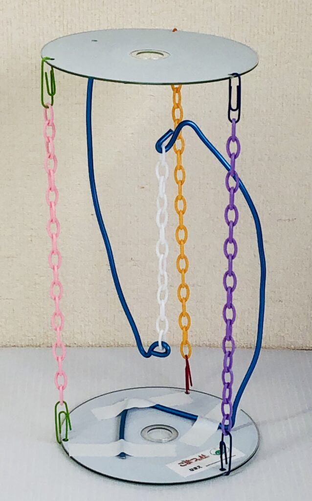 力とバランスをテーマに実験と体験をした後、カラーチェーンの引っ張る力だけでバランスして立つテンセグリティーのオブジェを作ろう!