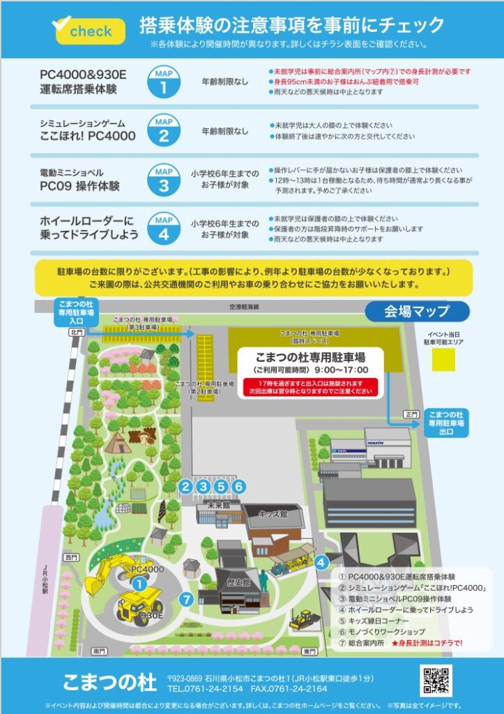 *「①PC4000&930E運転席搭乗体験」および「④ホイールローダーに乗ってドライブしよう!」は雨天中止となります。予めご了承ください。