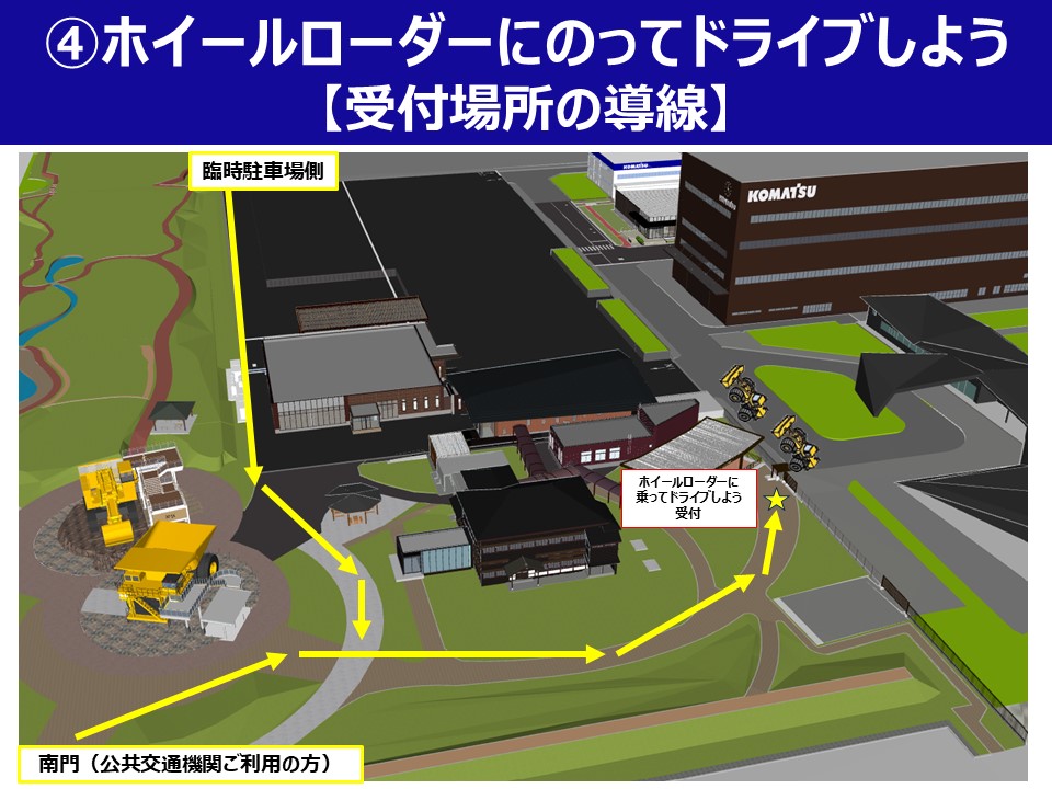 *「④ホイールローダーに乗ってドライブしよう!」の受付へのアクセスは、左記3枚目の図をご確認ください。