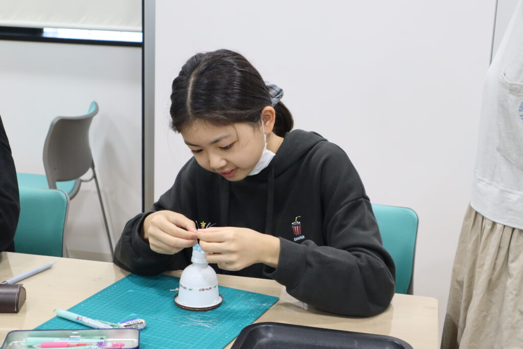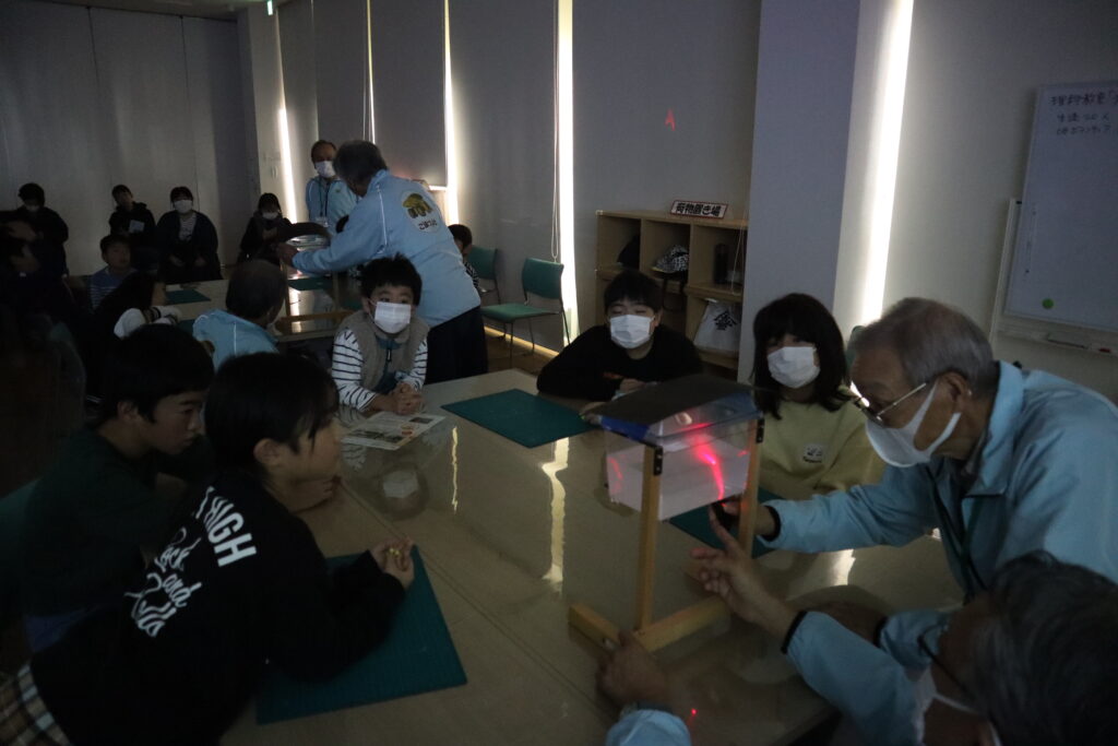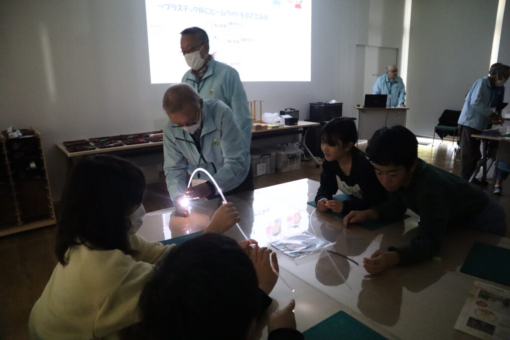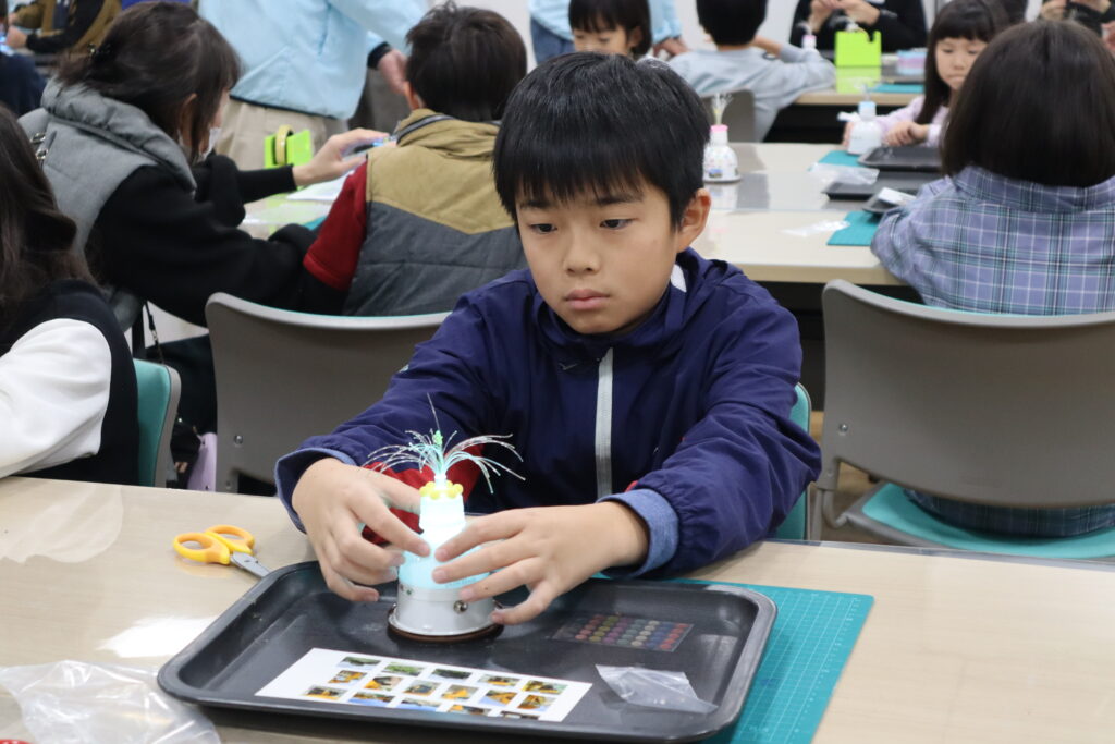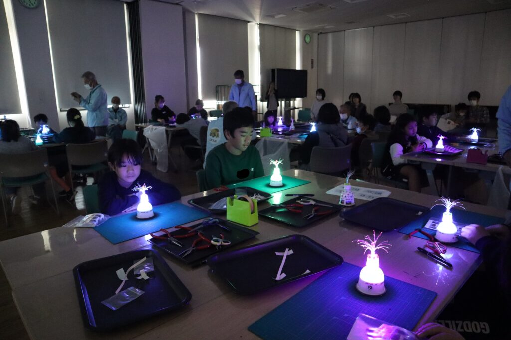 最初に光ファイバーの歴史や構造・用途について学びました。光は空気中では直進しますが、光ファイバーの中は曲がっていても進むことを実験にて体感しました。その後、光ファイバーの原理を応用し、釣り糸やペットボトルを利用して7色に変化するLEDで光るオブジェを作りました。噴水のように飾りつけた釣り糸の先端が放つ七色に変わりゆく幻想的な光に、子ども達だけでなく大人達も癒しのひと時となりました。