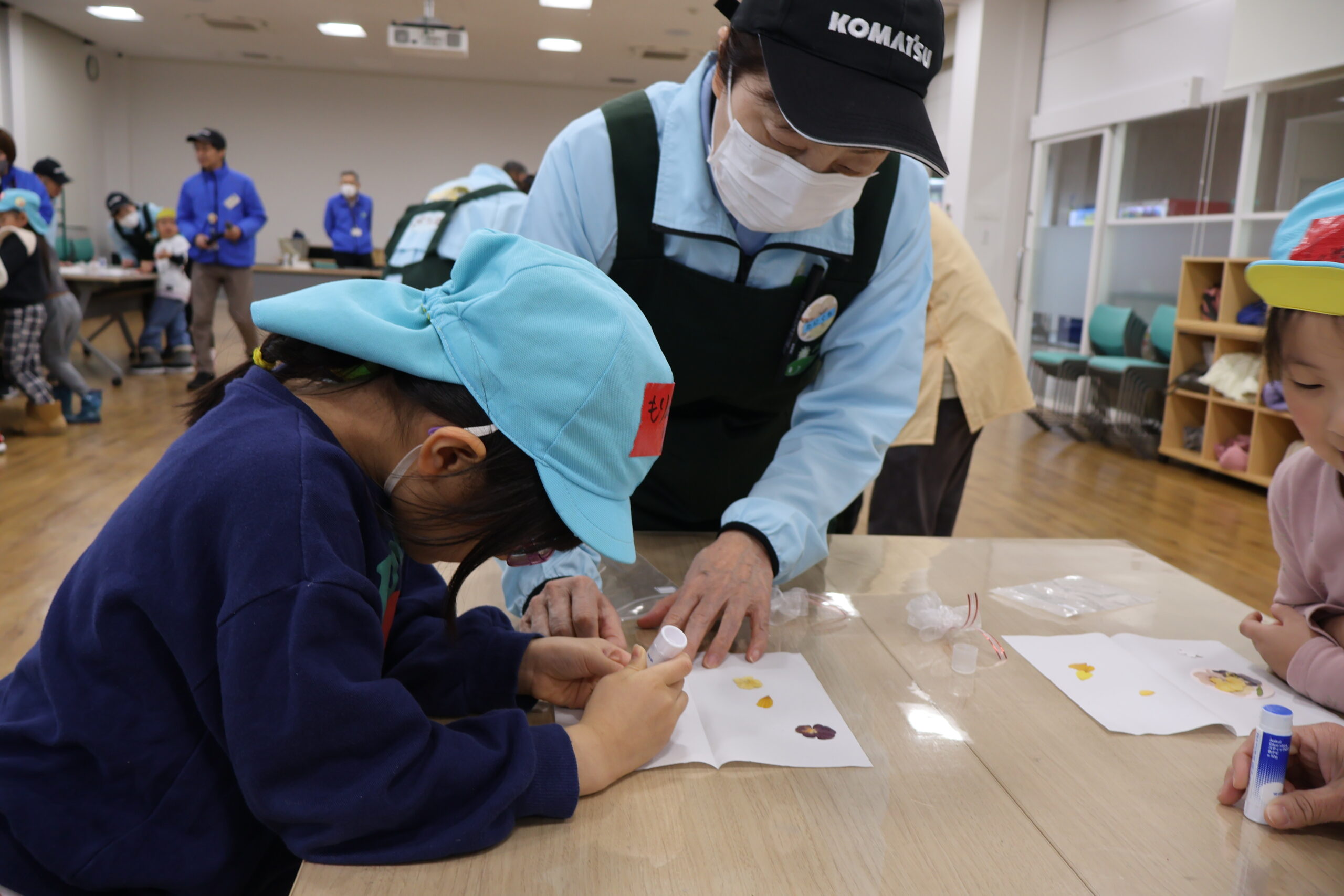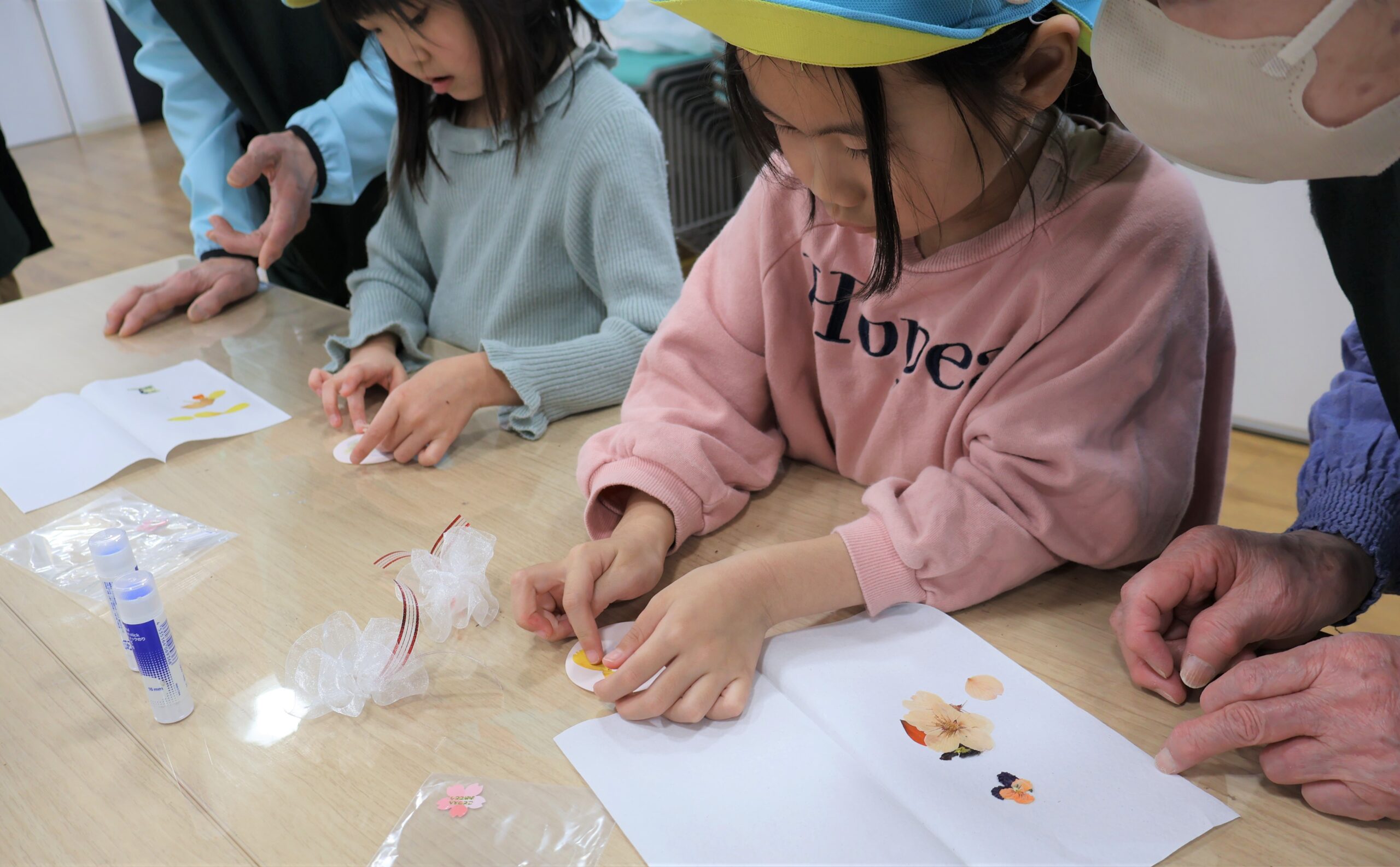 こまつの杜で作った押し花と、園で作った押し花の二種類の押し花をコサージュにしていきます。