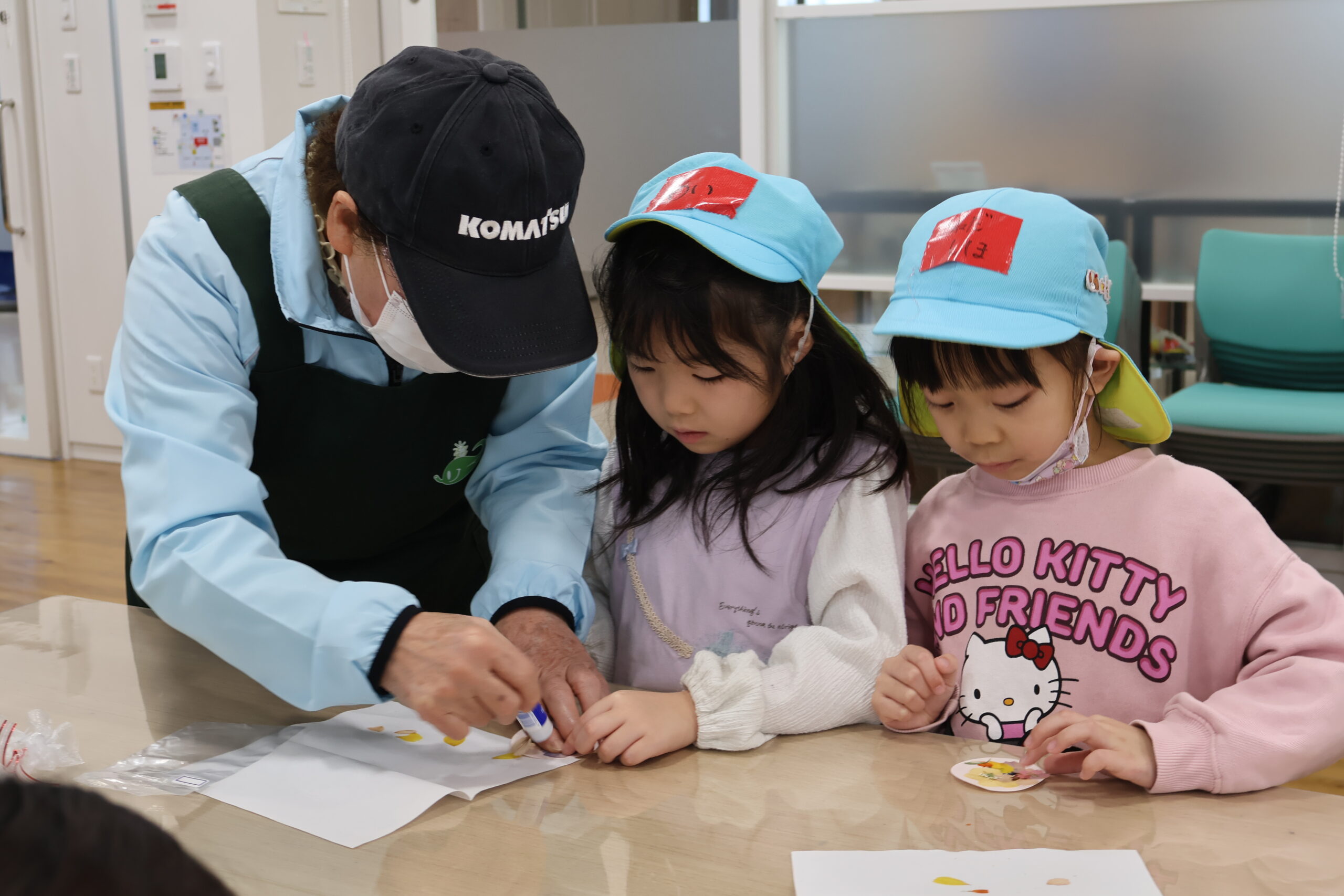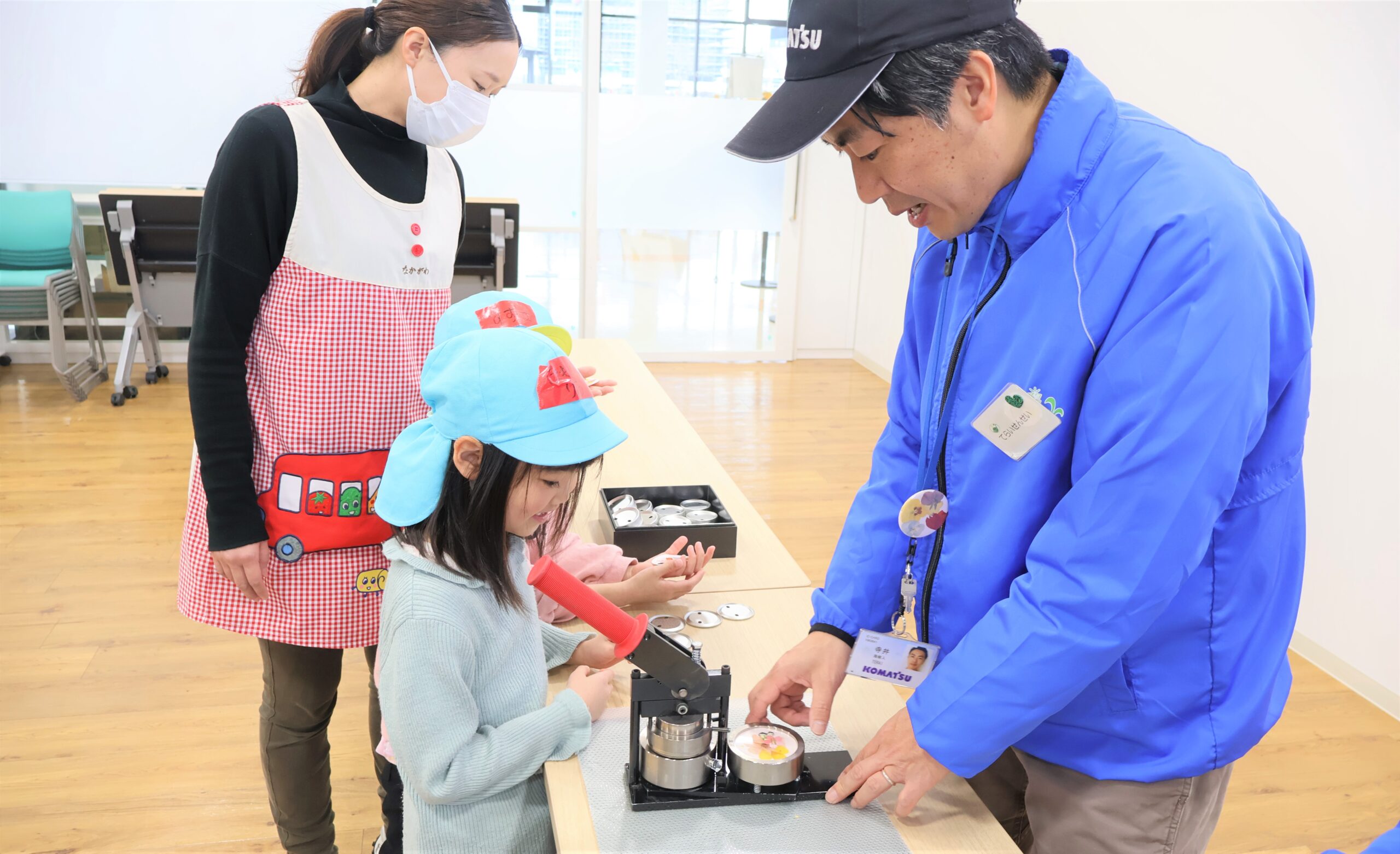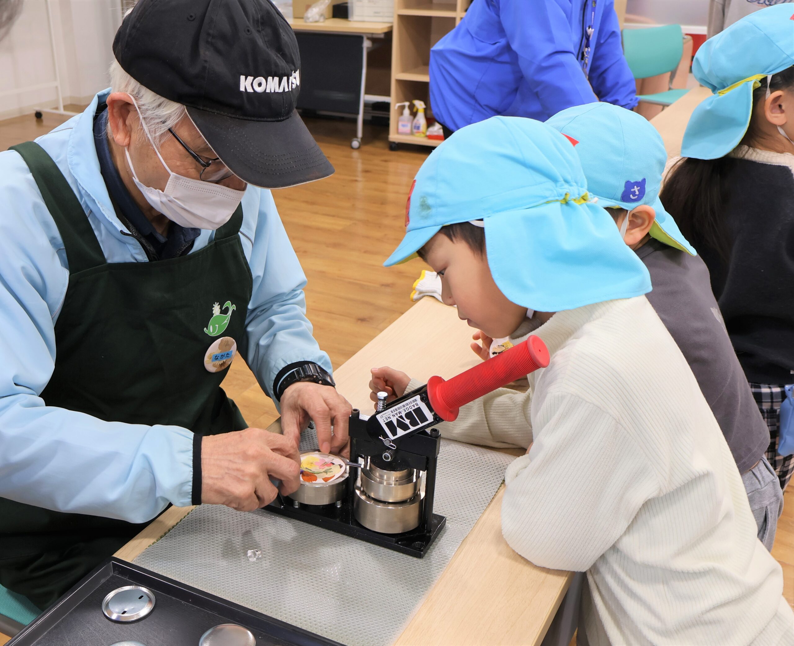 日本花の会の講師・寺井海樹人(てらいみきと)先生とOBボランティアの永田さんに缶バッチにしてもらいます。
