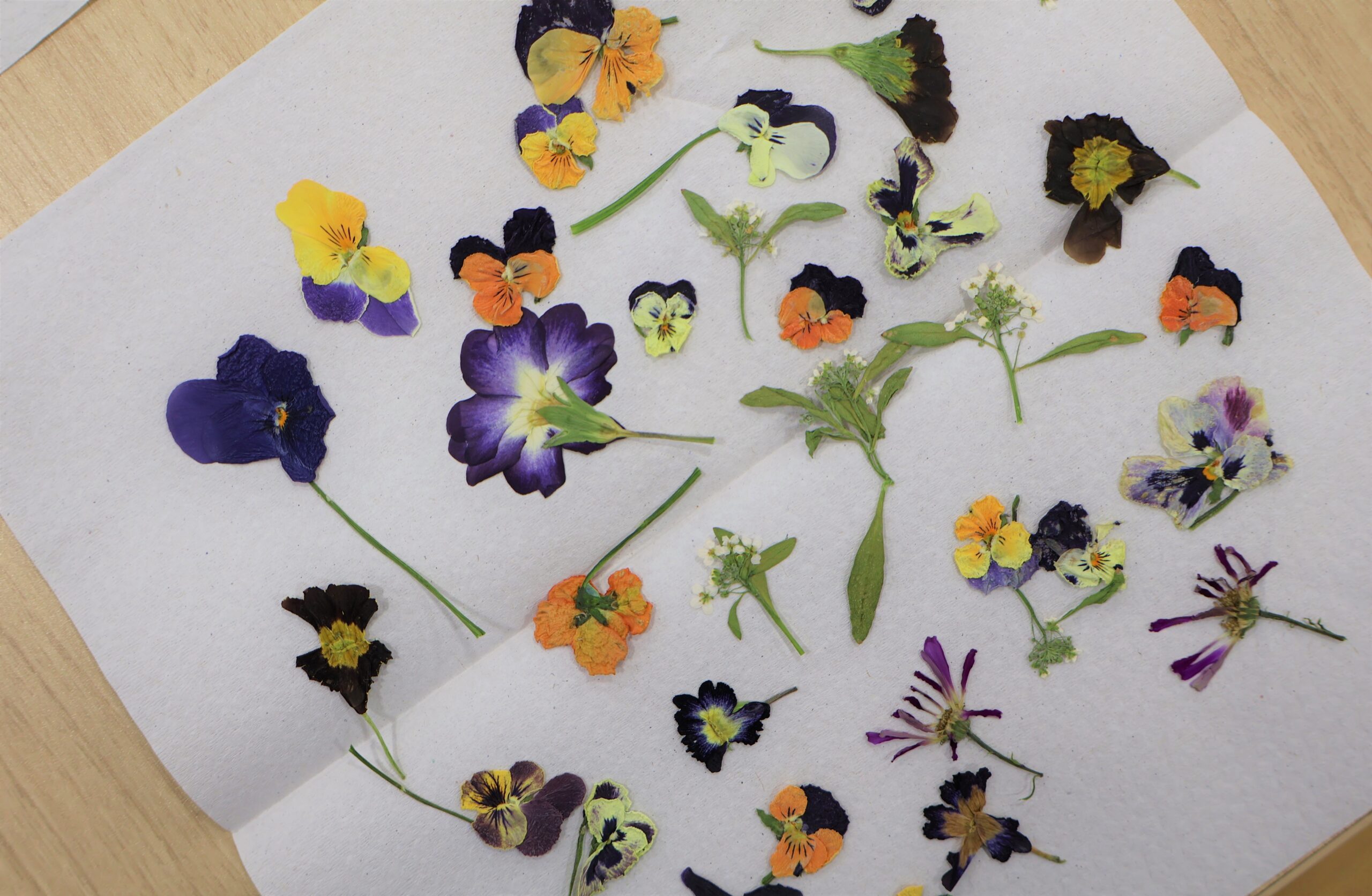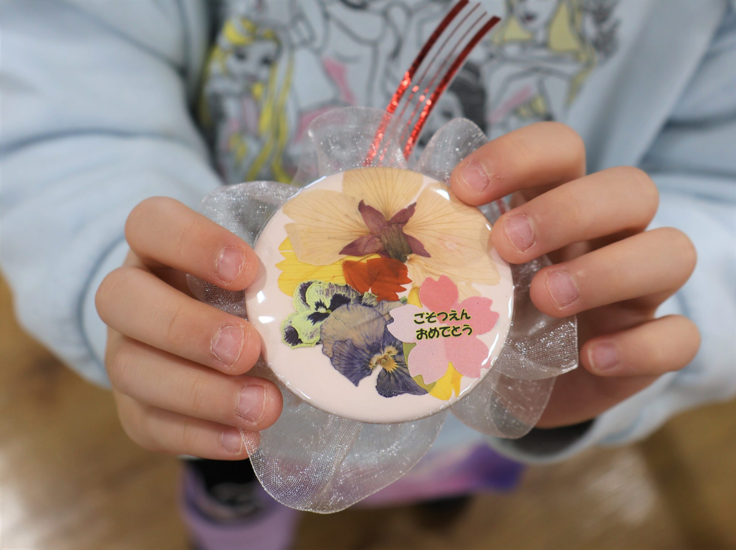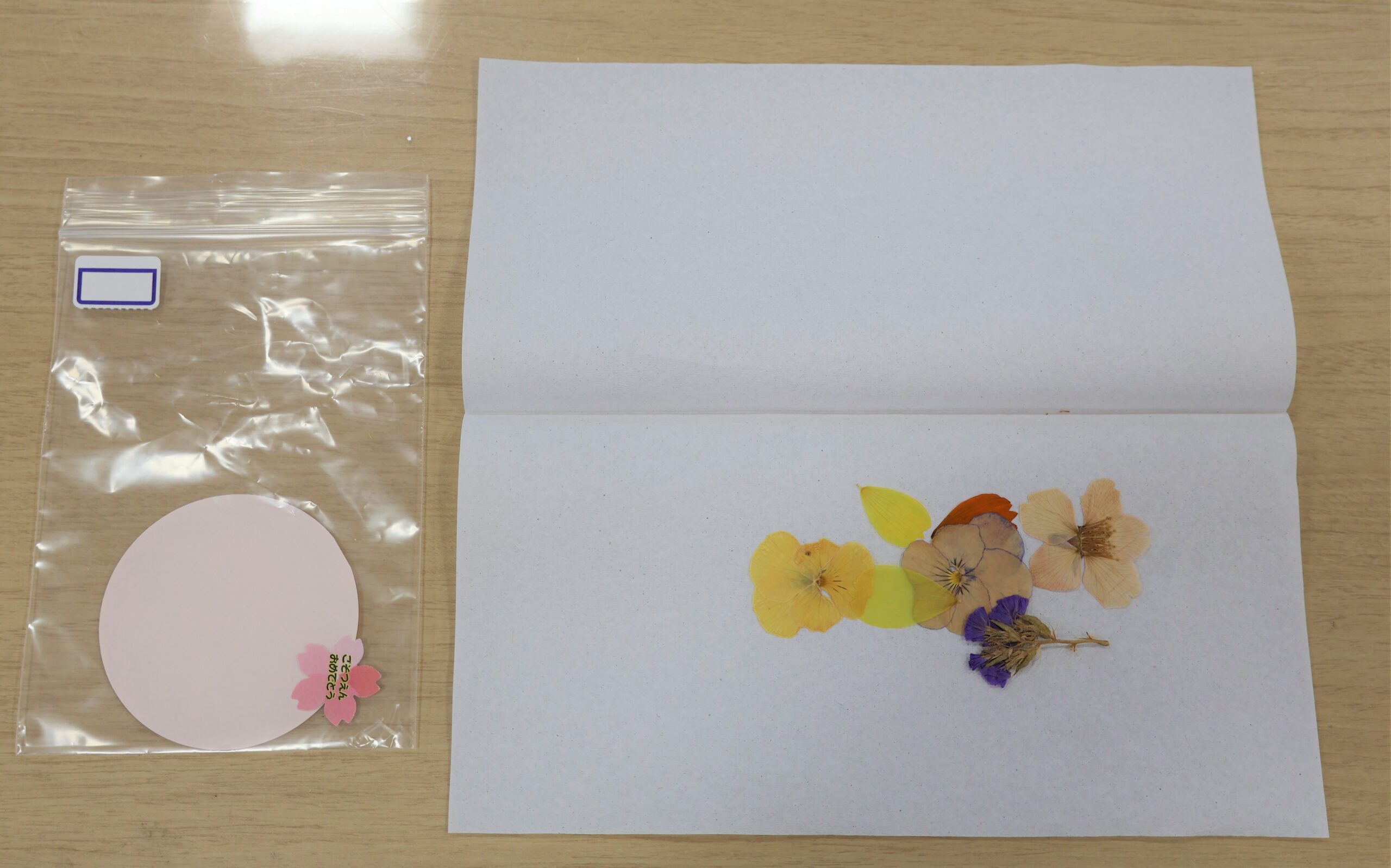 花育活動の1年の活動の締めくくりに、種から育てた花を押し花にしました。そして押し花を利用して缶バッチでコサージュ作りを行いました。