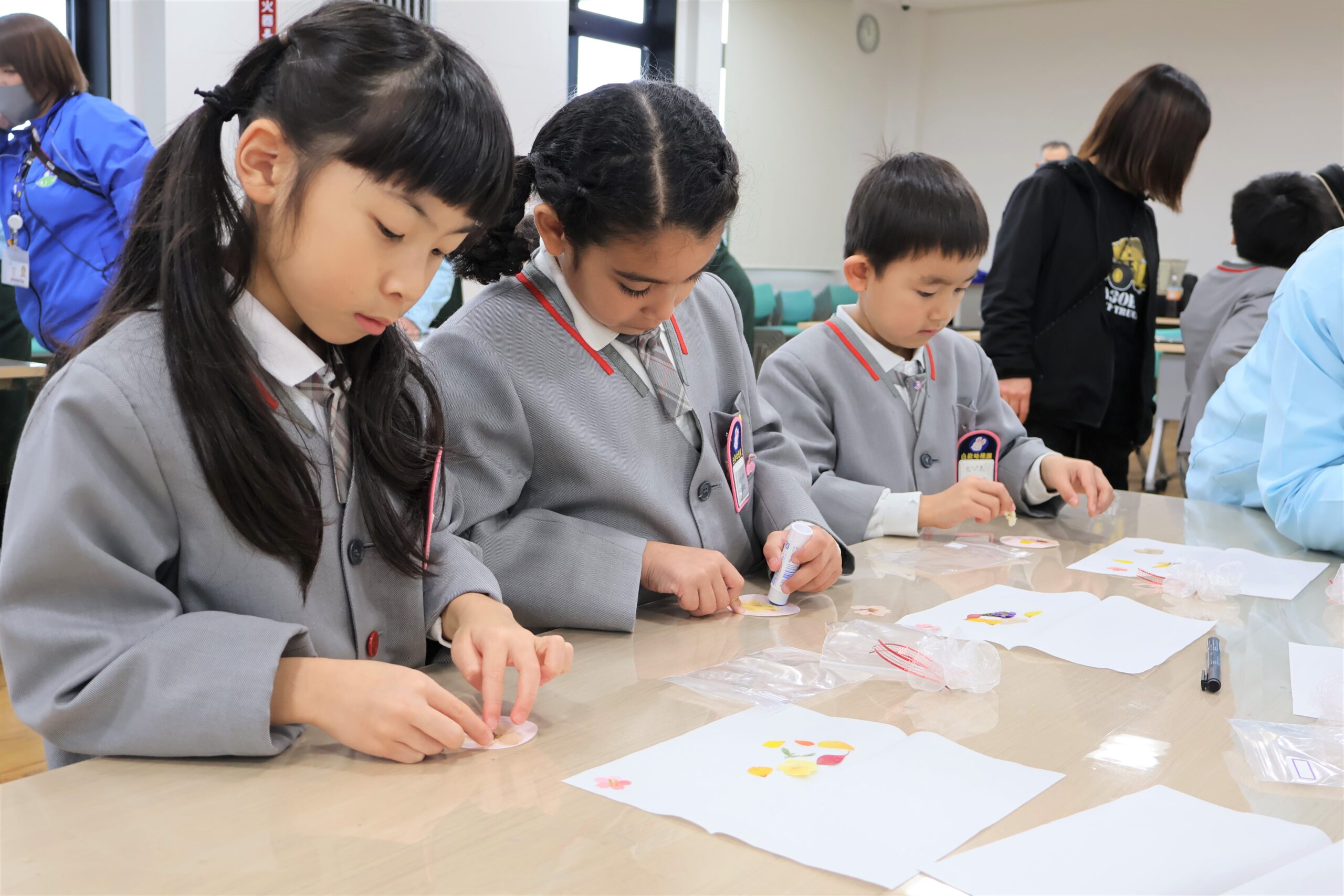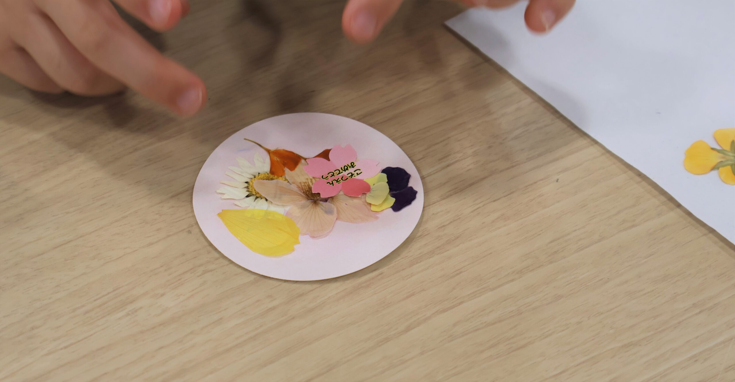 花育活動の1年の活動の締めくくりに、種から育てた花を押し花にしました。そして押し花を利用して缶バッチでコサージュ作りを行いました。