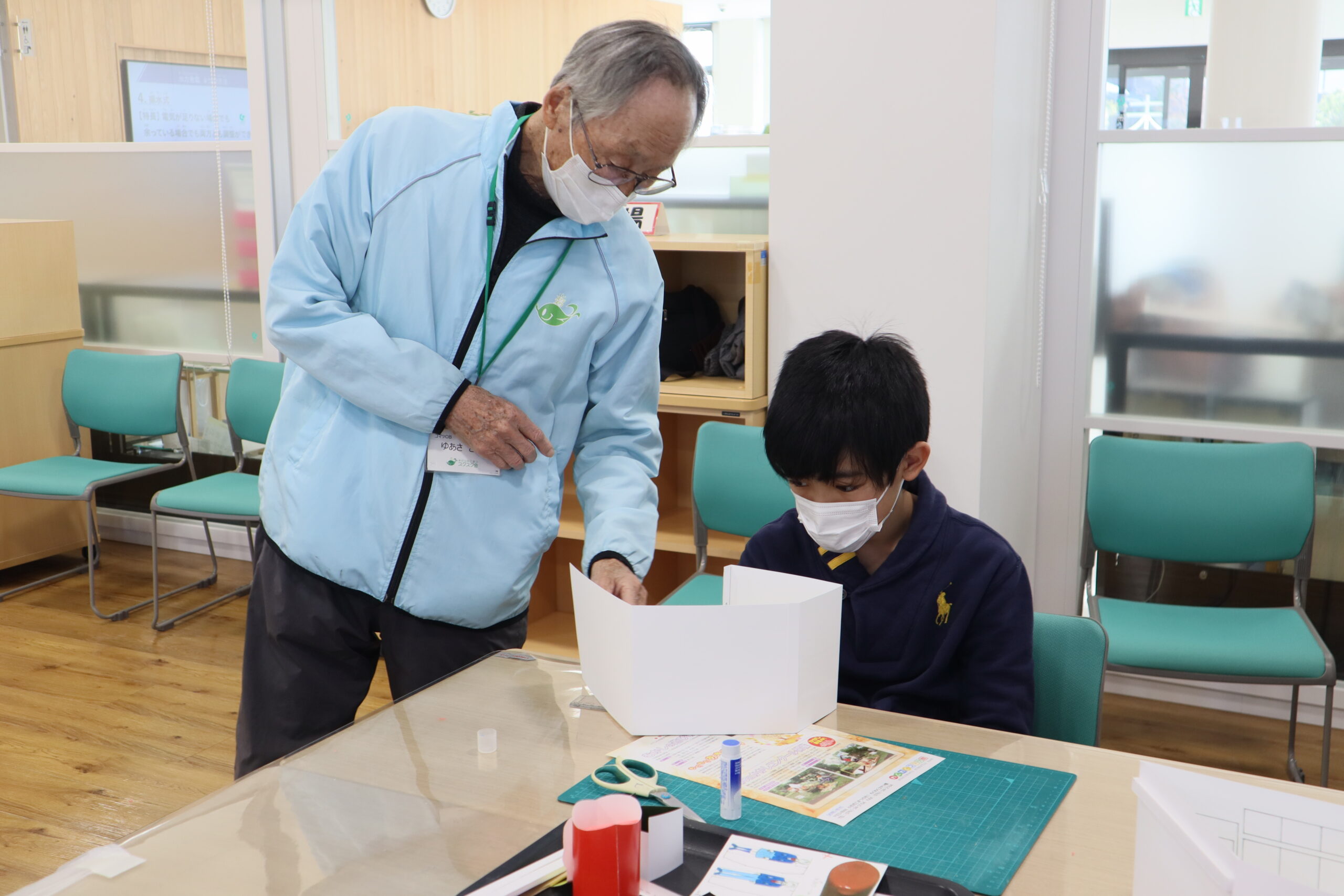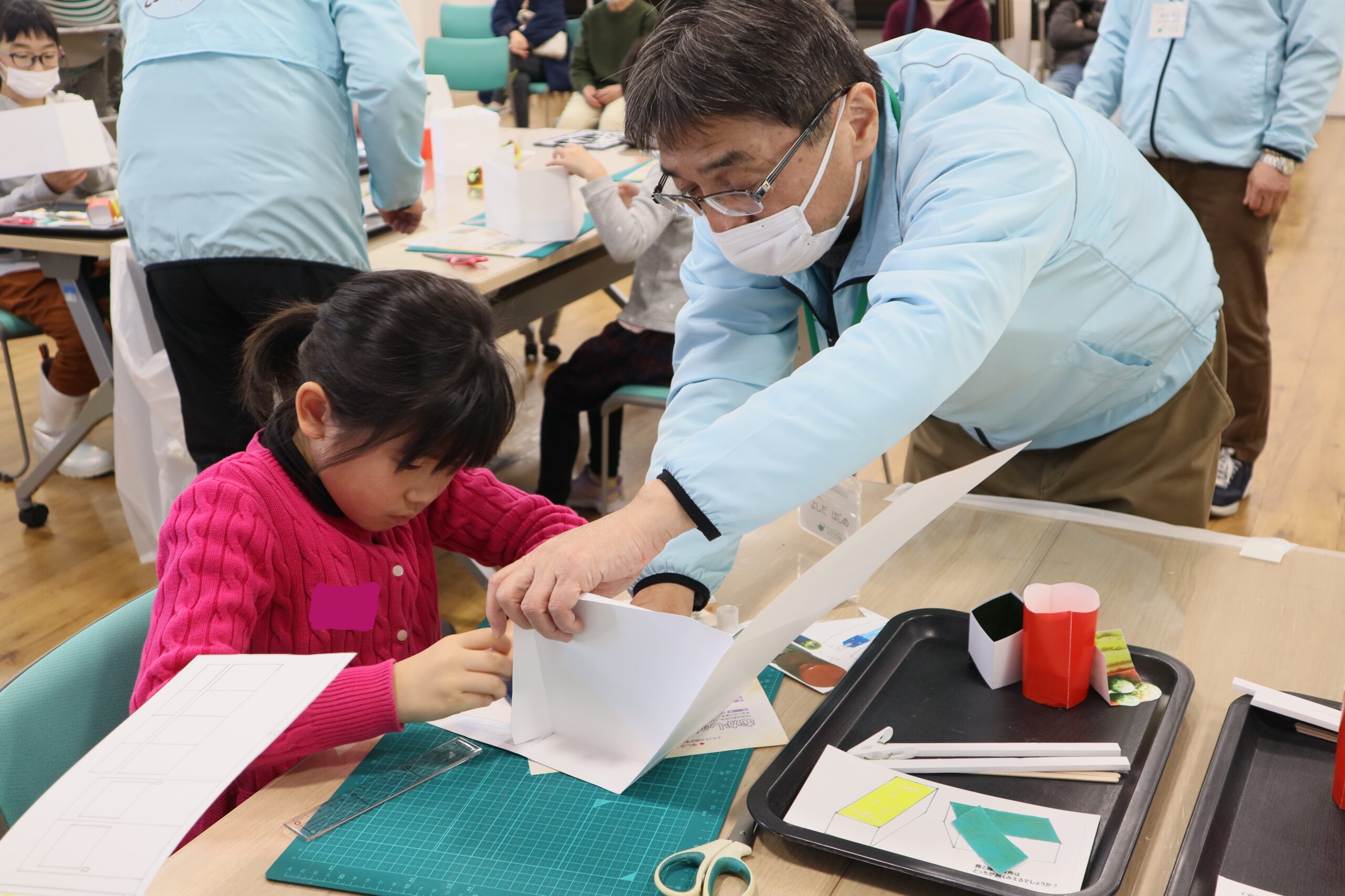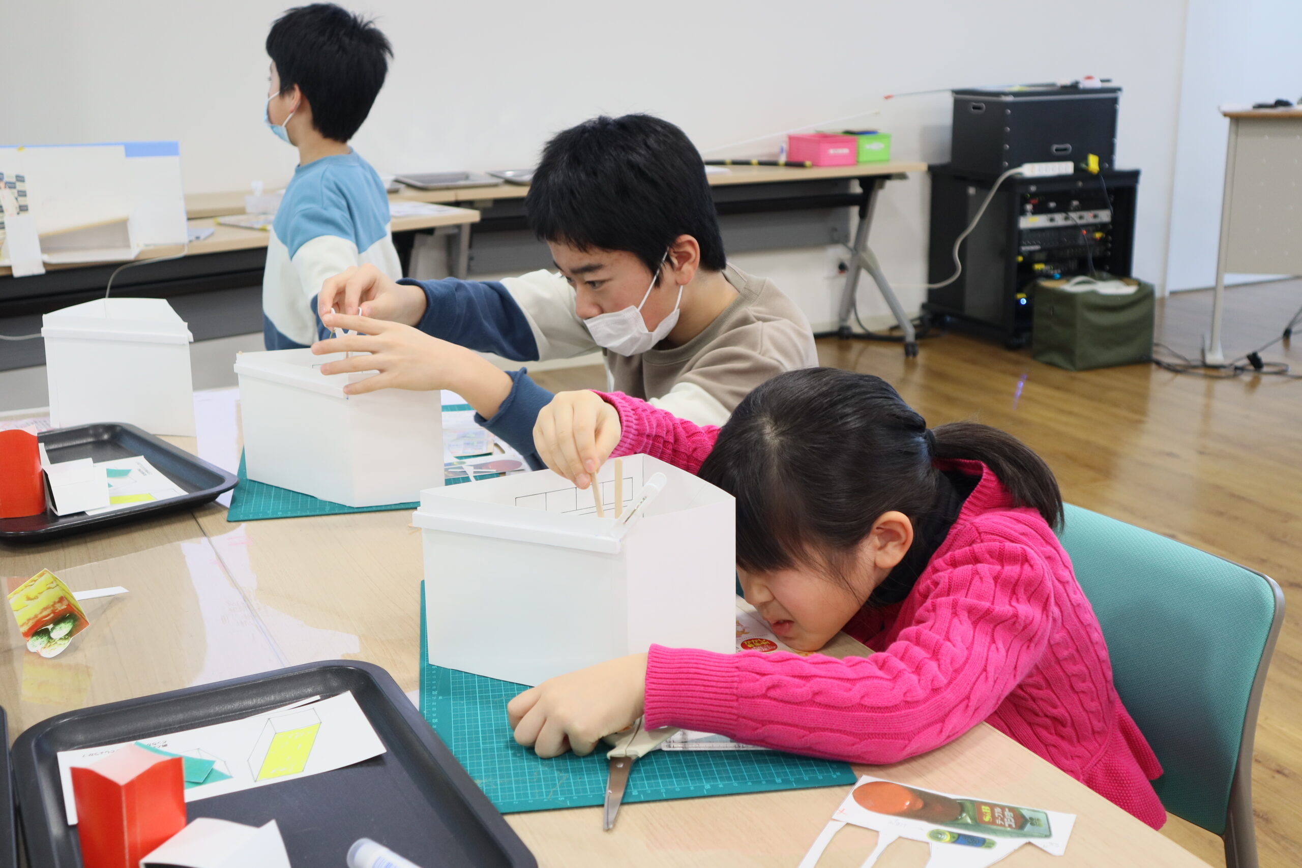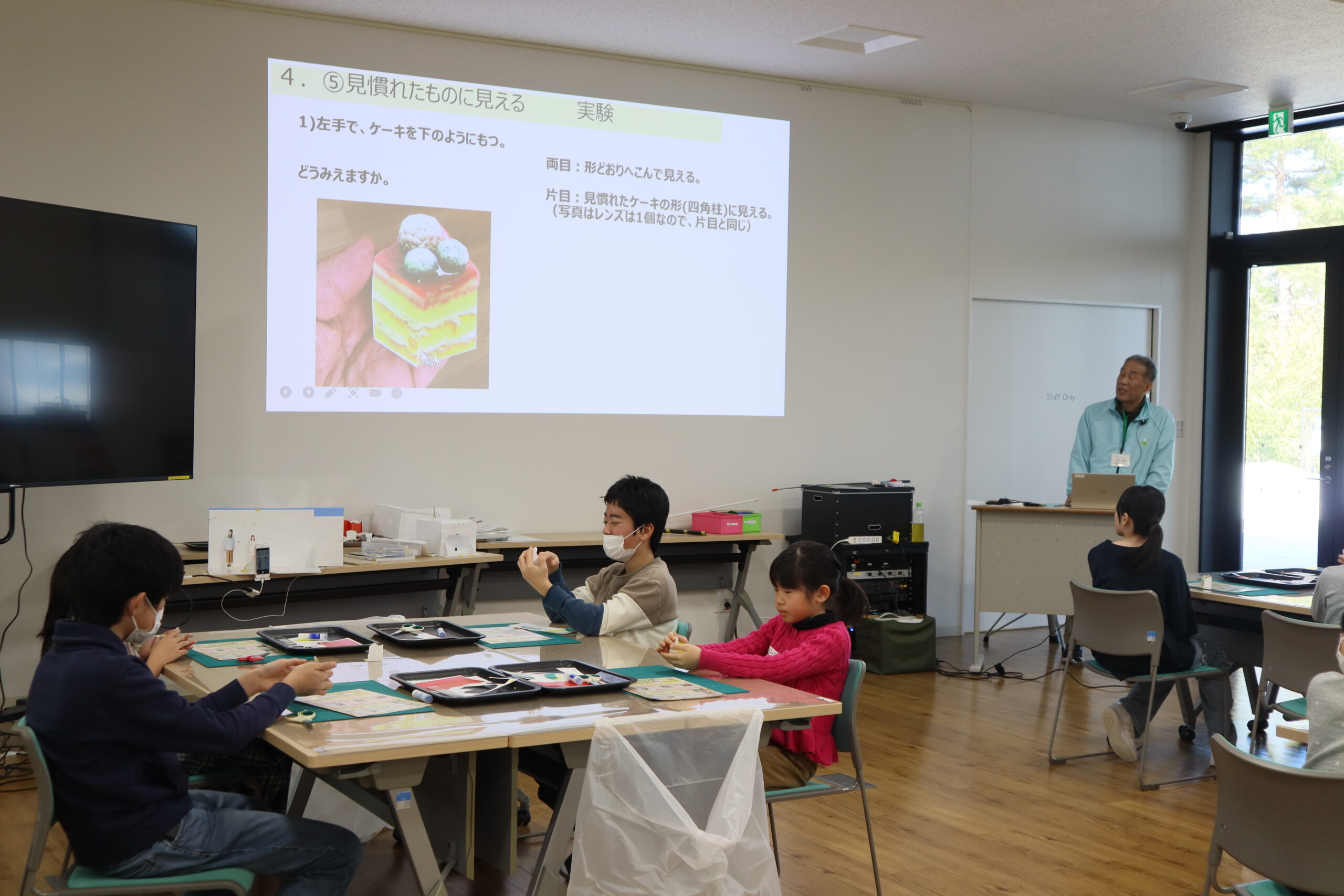 その後、実際に工作を通じて、錯覚体験をしました。宙に浮くケーキや矢印を鏡に映すと矢印が逆に見える工作、丸に見えるのに鏡に映すと四角に見える工作をして、錯覚を体感してもらい、最後に学校の教室をイメージした錯覚の部屋を工作しました。