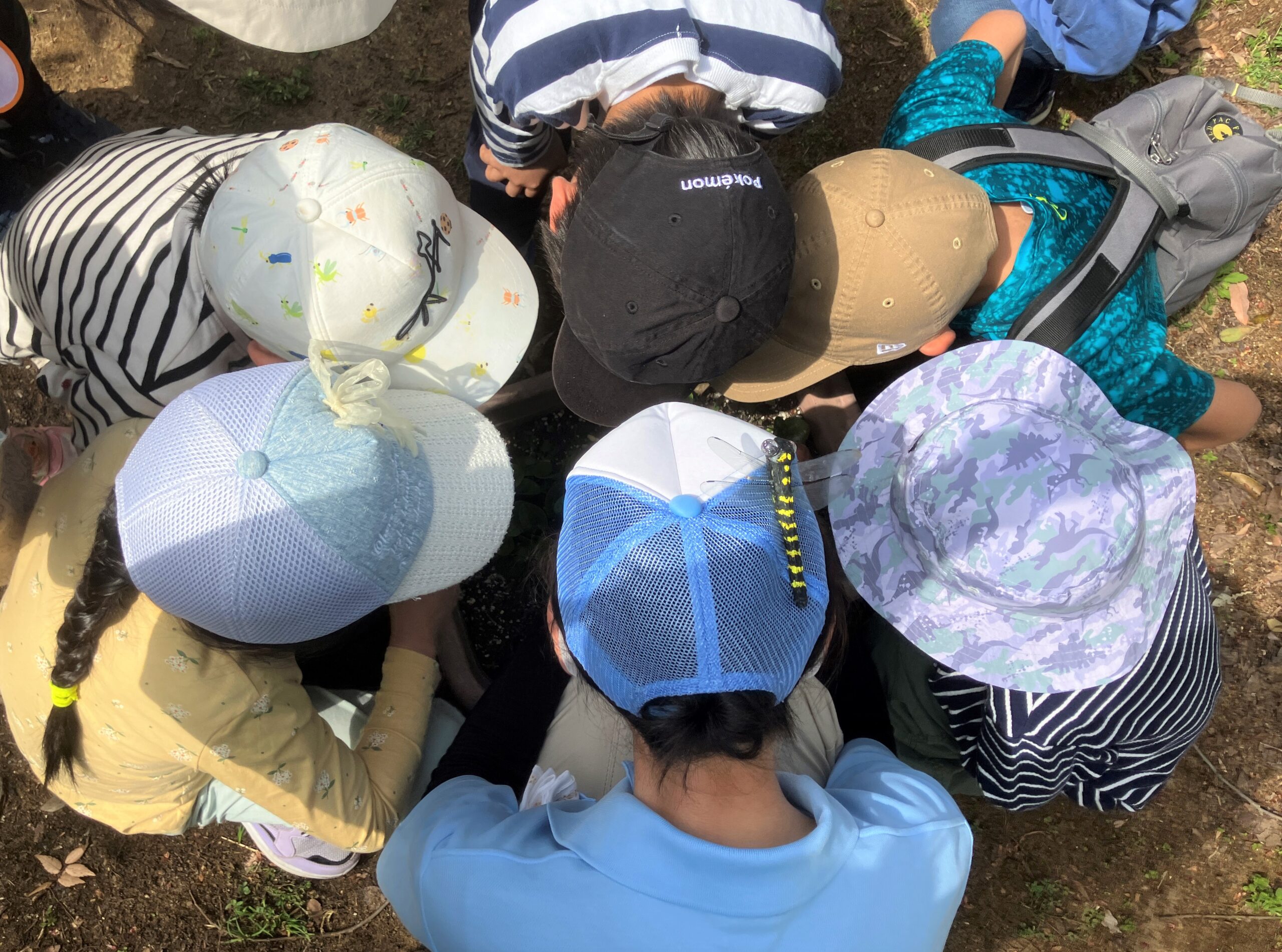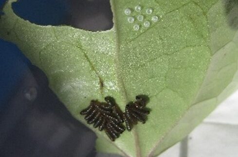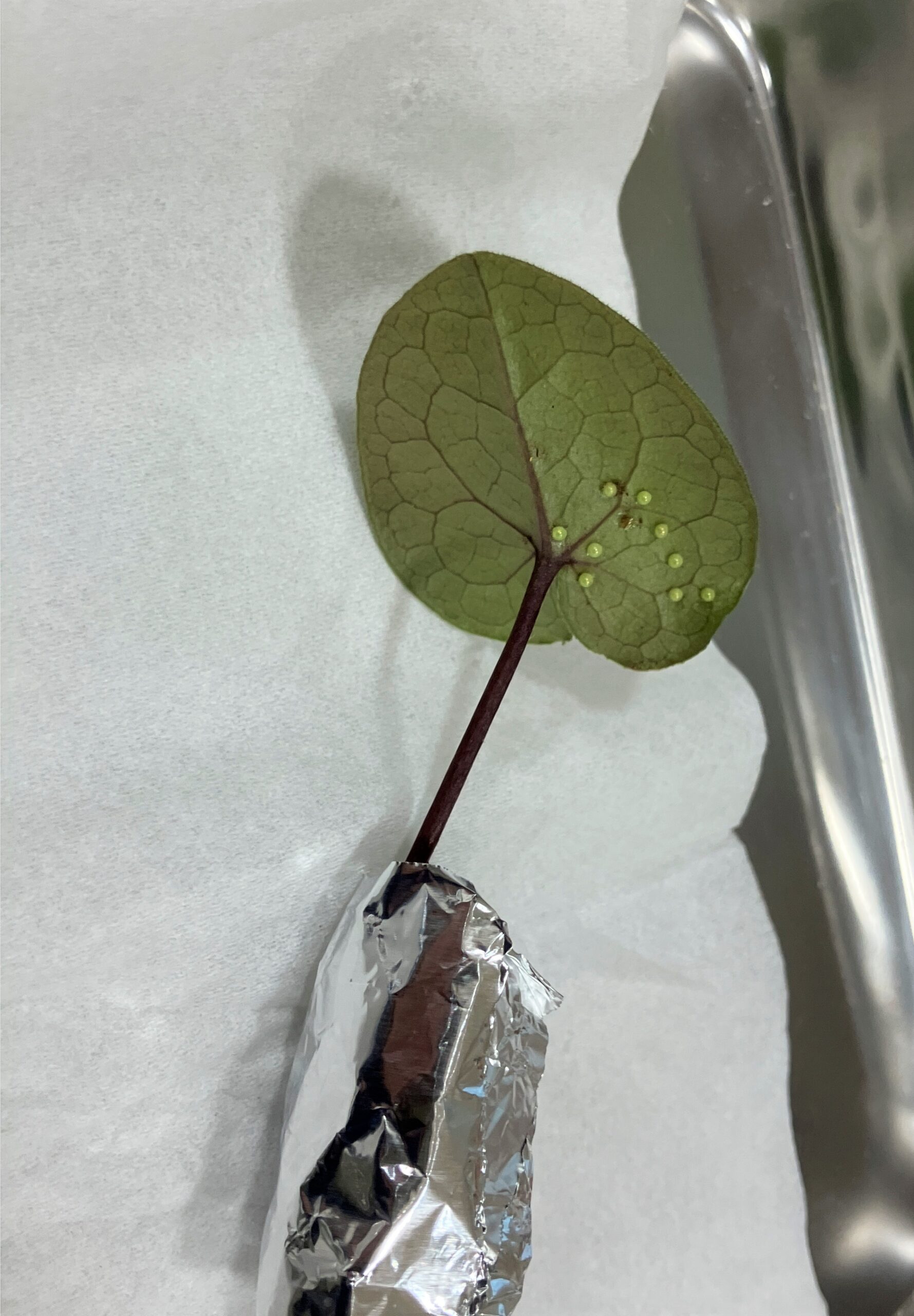 そして、通常なら幼虫の観察・お世話をするのですが、今年は卵からの孵化がとても遅く、残念ながら教室開催の時には一匹も孵化していませんでした。カンアオイの裏にこのように、卵が産みつけてあります。