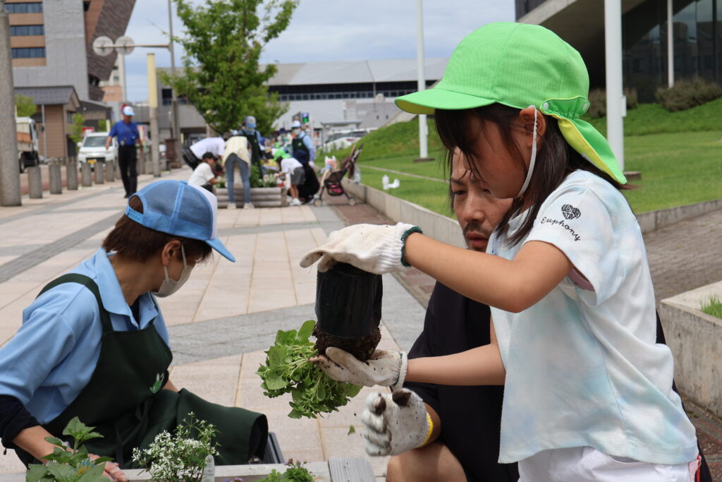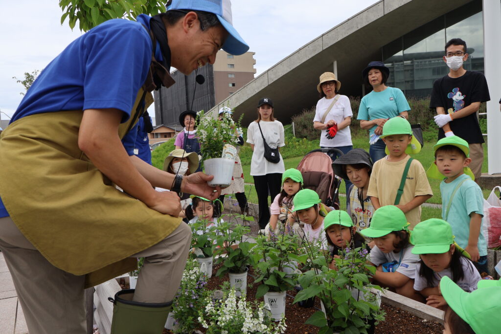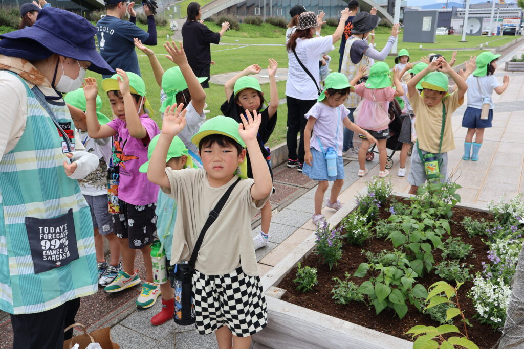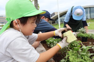 あたか認定こども園の子供たちと花育活動でサイエンスヒルズ前にあるおもてなし花壇にお花を植えました!
