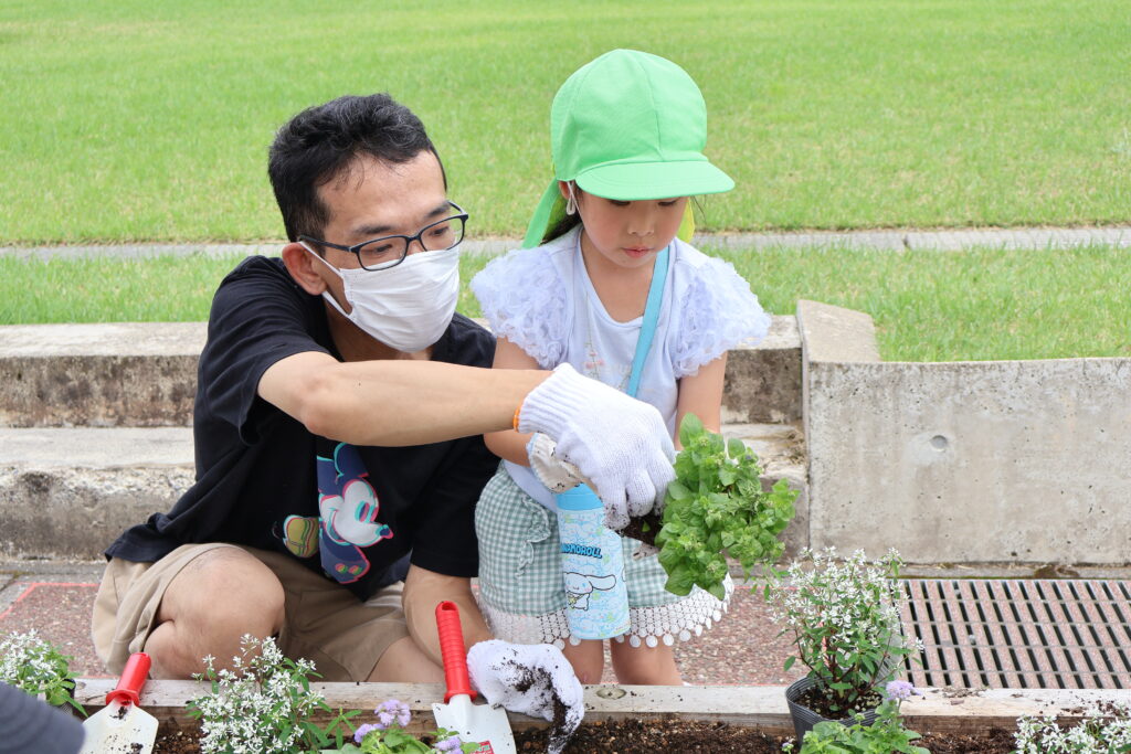 寺井先生から花苗の植え方のポイントを教えてもらい、保護者たちと一緒に「愛情・水・太陽」がテーマの花壇を完成させます!