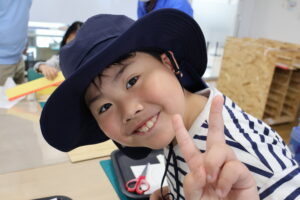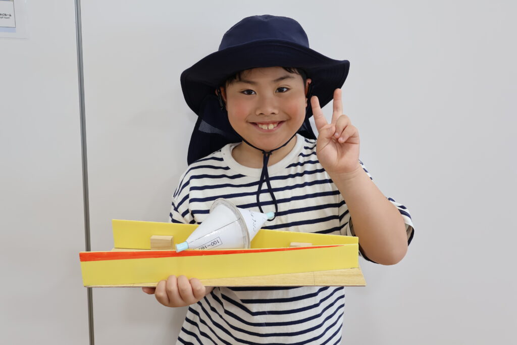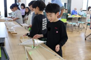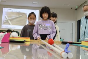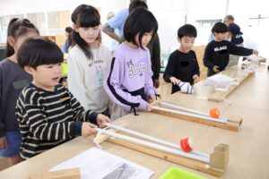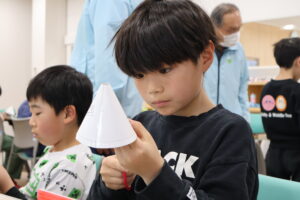 子どもたちは「えっ?なんで??」と円錐のコマが低いところから高いところへ上っていくことに驚いていました。