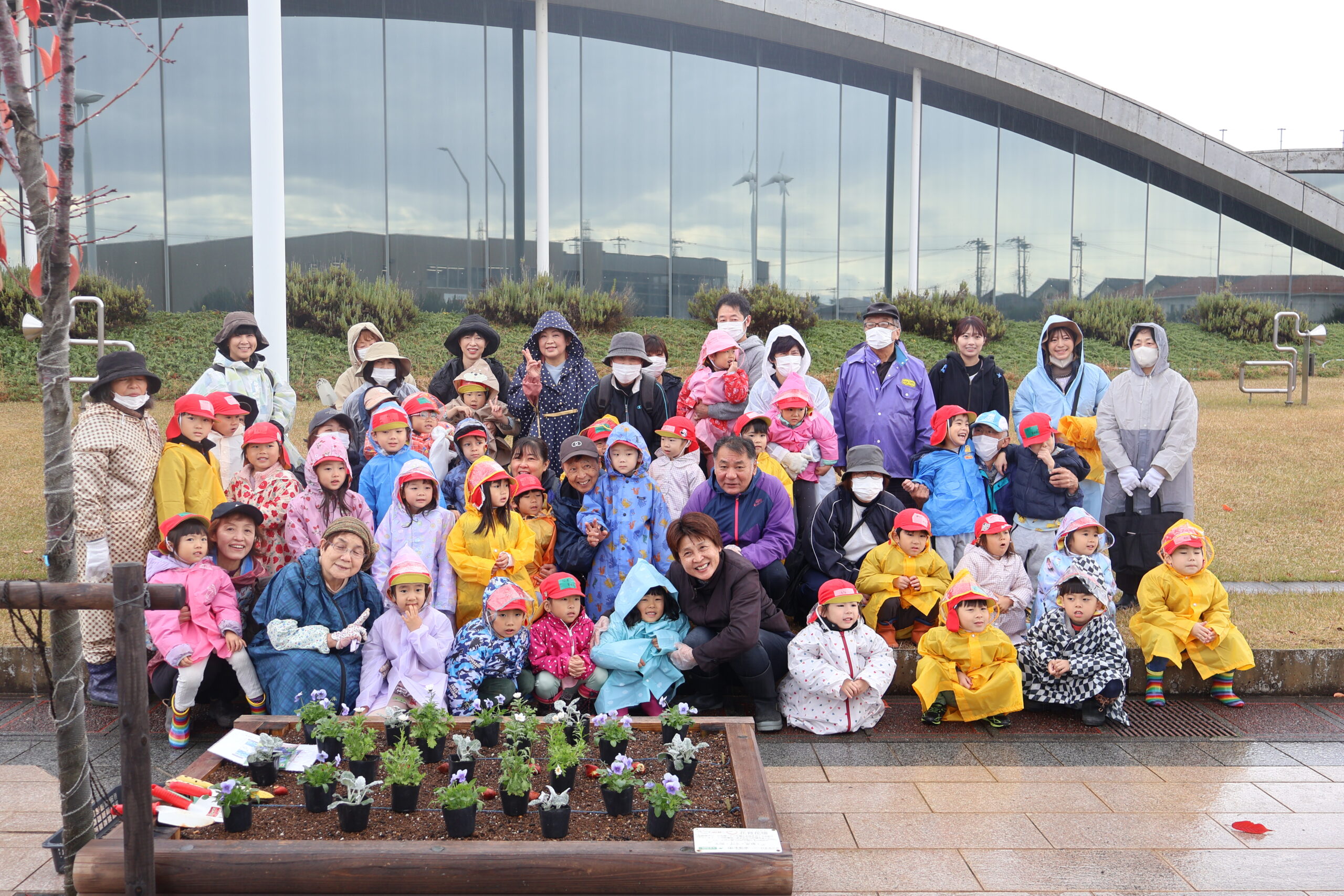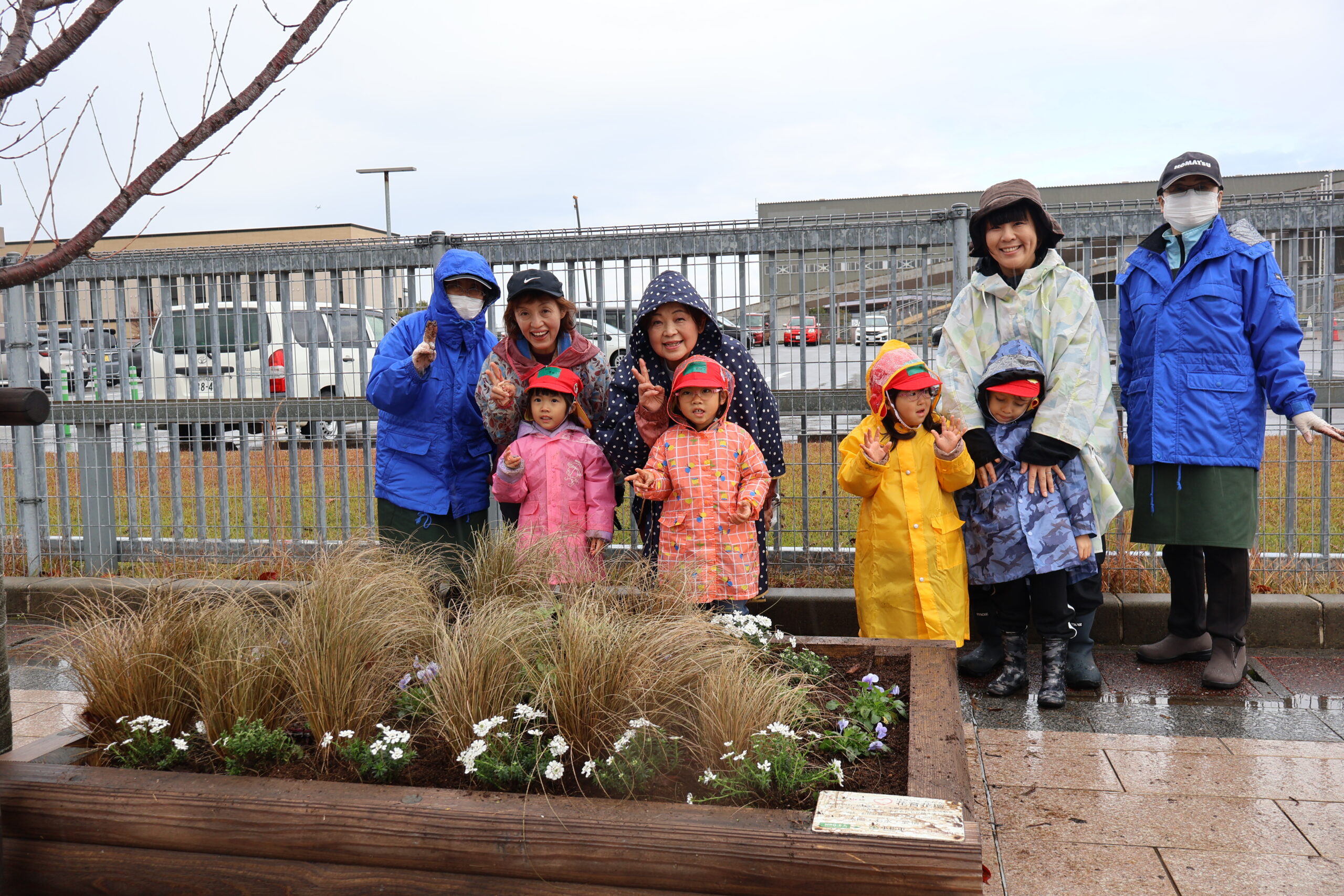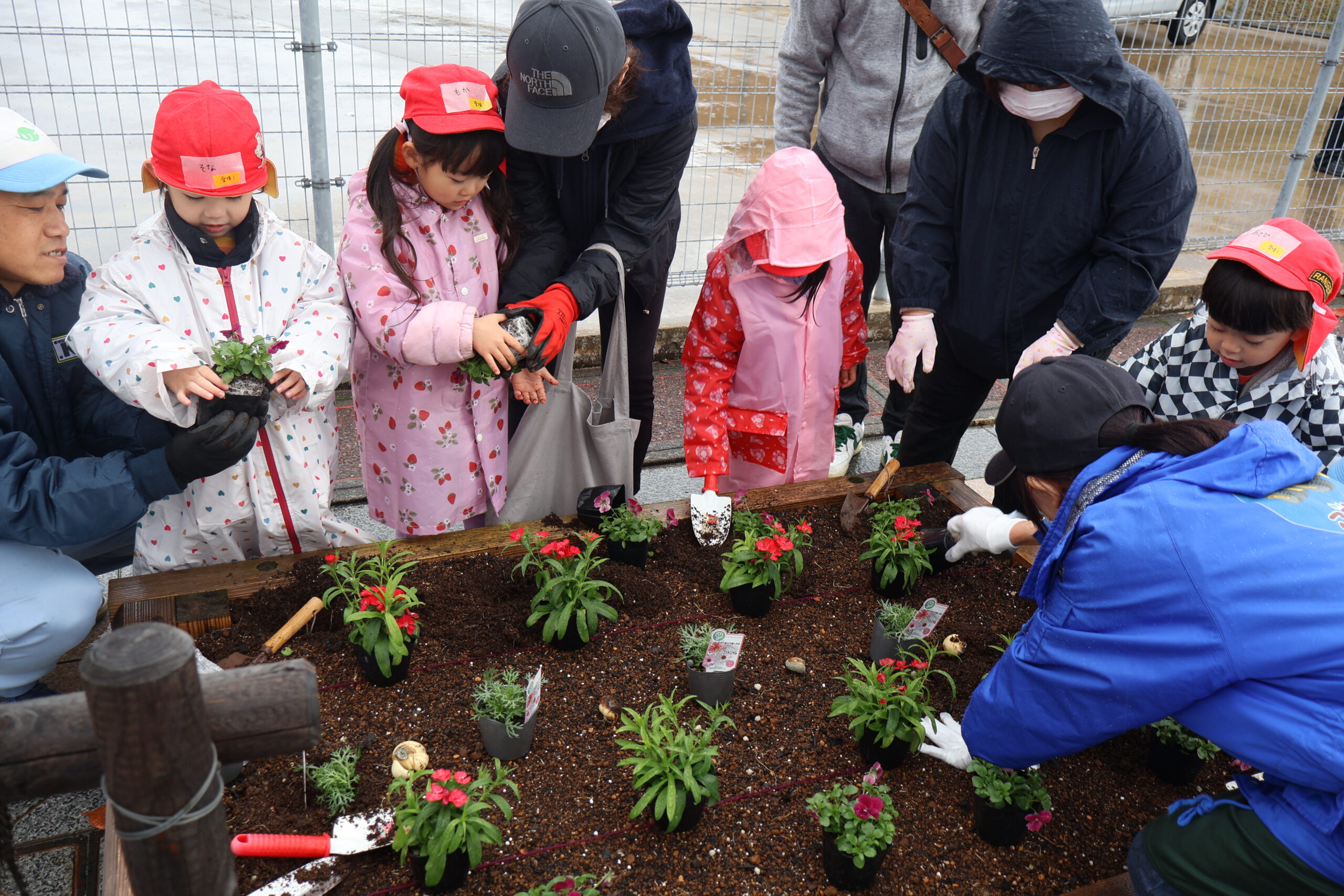 今回は小雨の中での活動となりましたが、日本花の会の講師・寺井海樹人(てらいみきと)先生と松陽こども園の子供たち、そして子供たちの祖父母たちと花壇づくりを行いました。