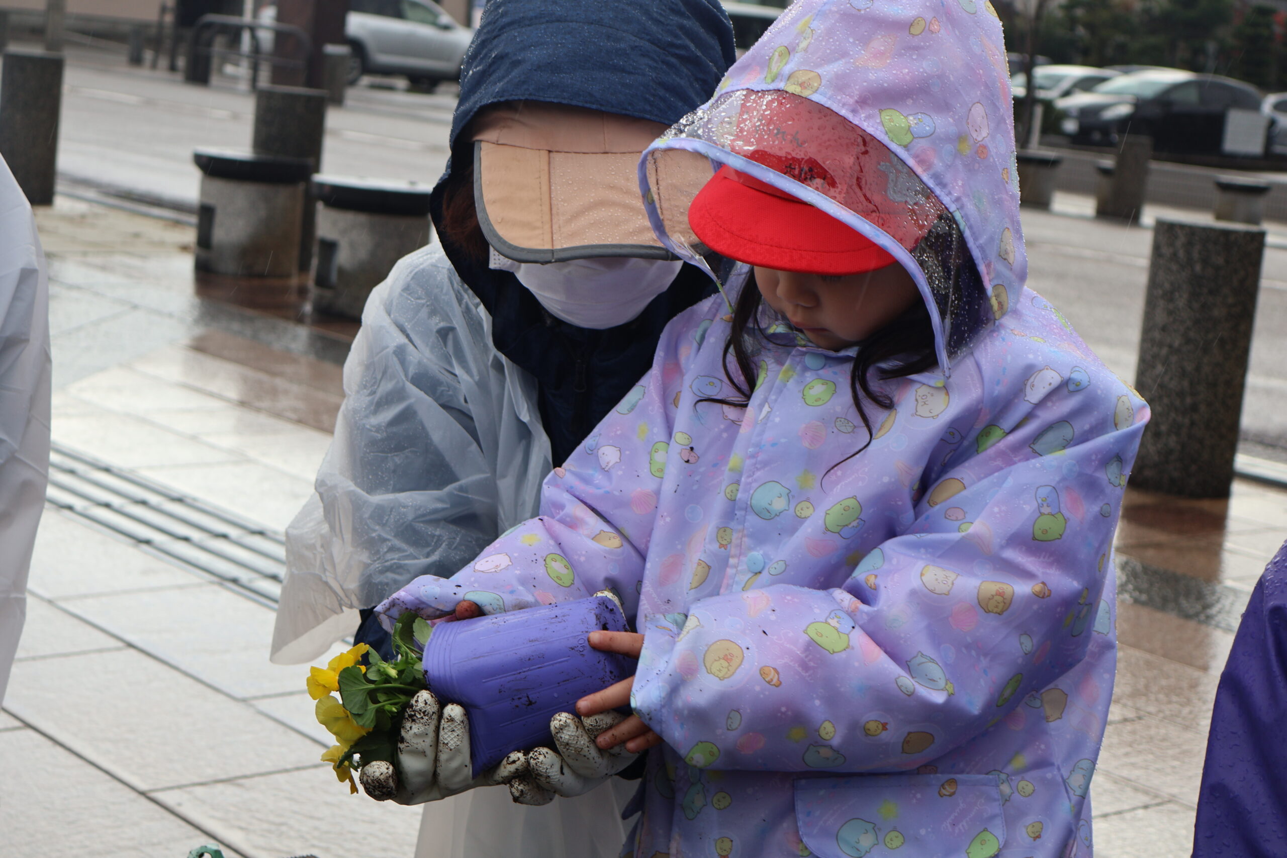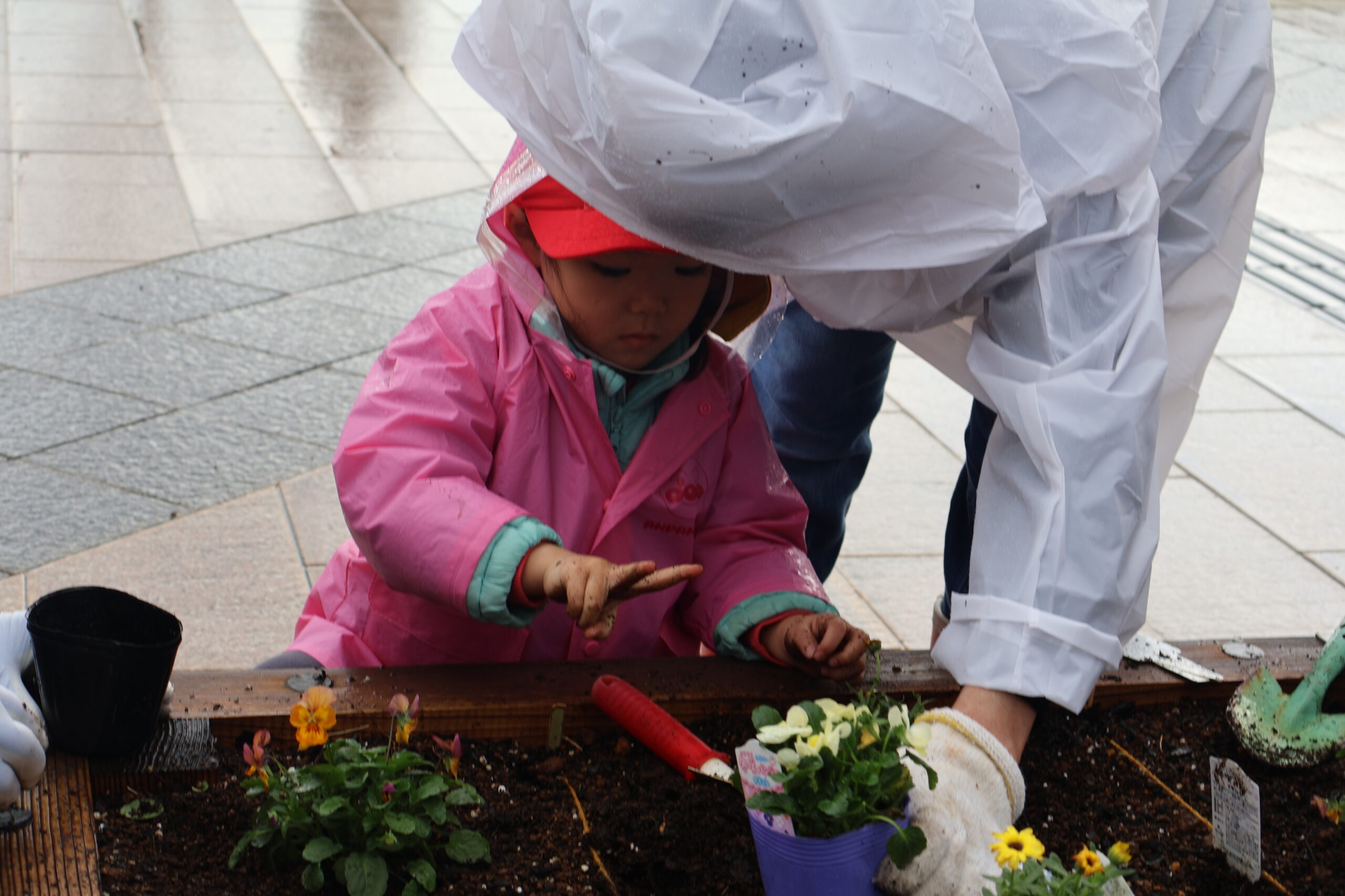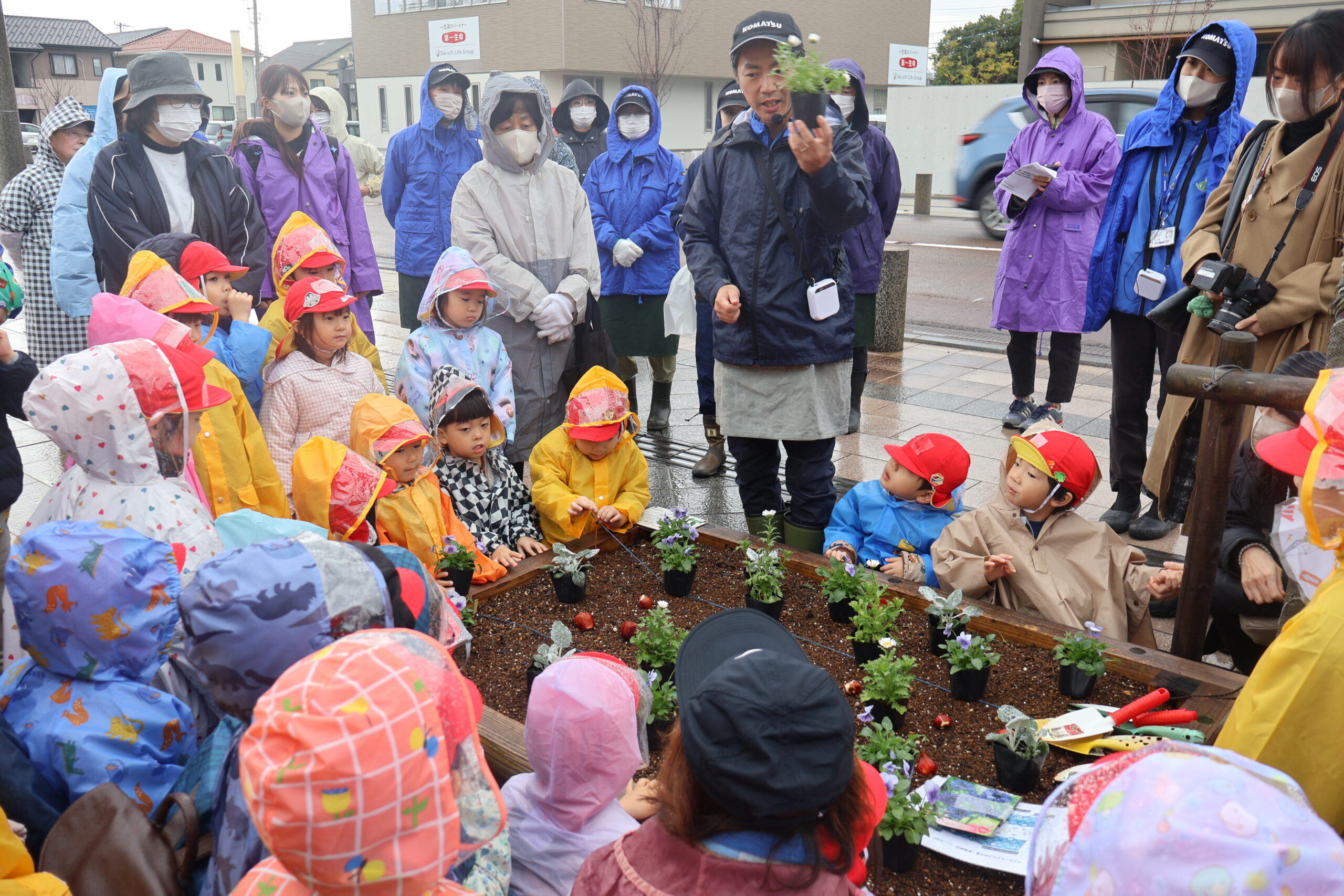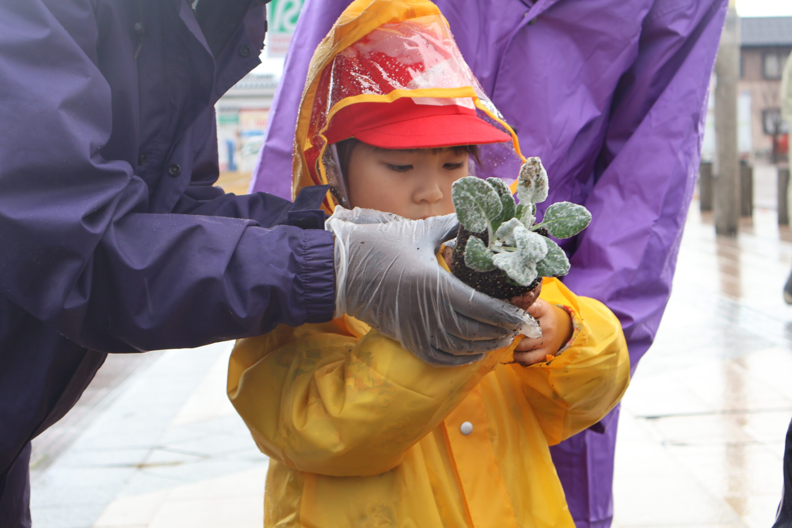 今回は小雨の中での活動となりましたが、日本花の会の講師・寺井海樹人(てらいみきと)先生と松陽こども園の子供たち、そして子供たちの祖父母たちと花壇づくりを行いました。