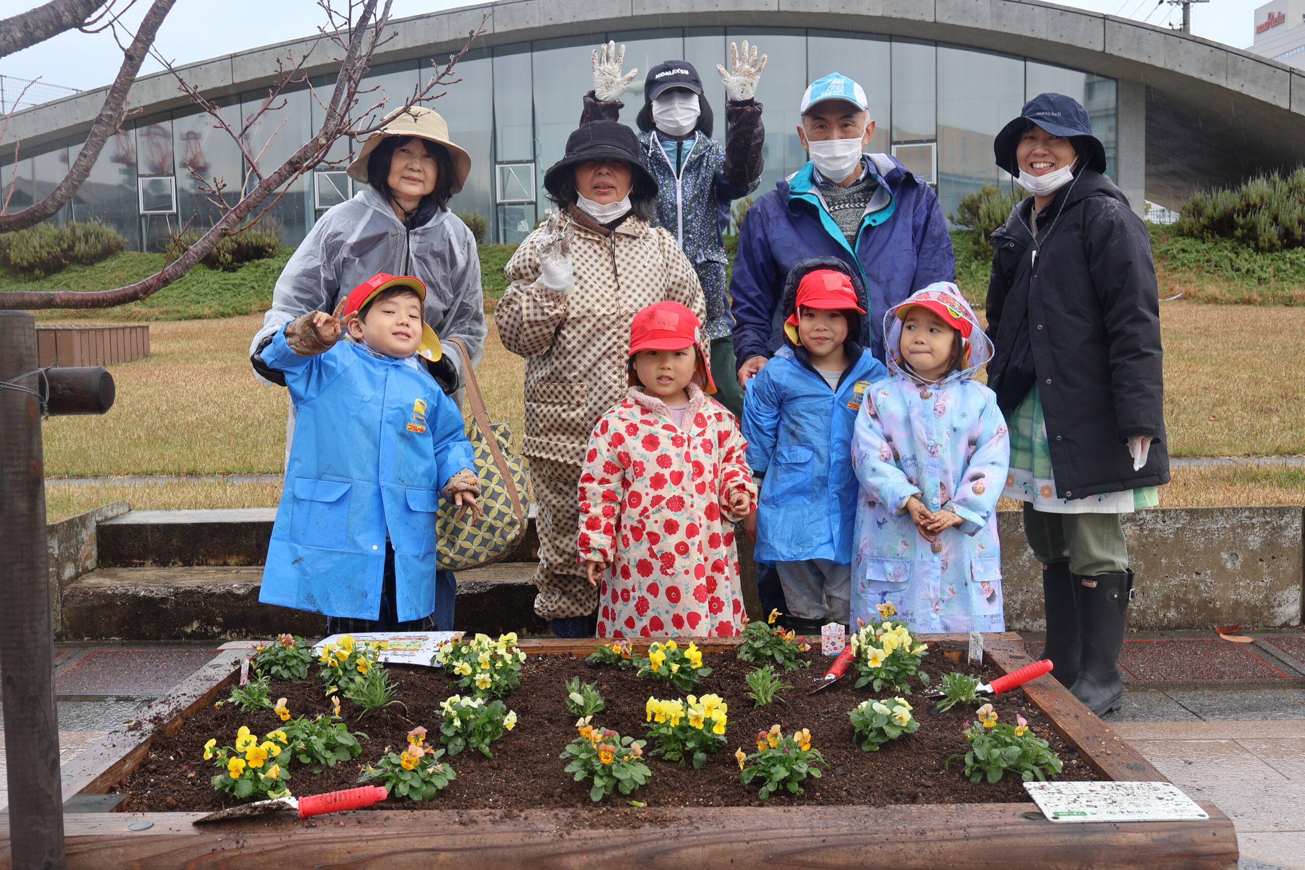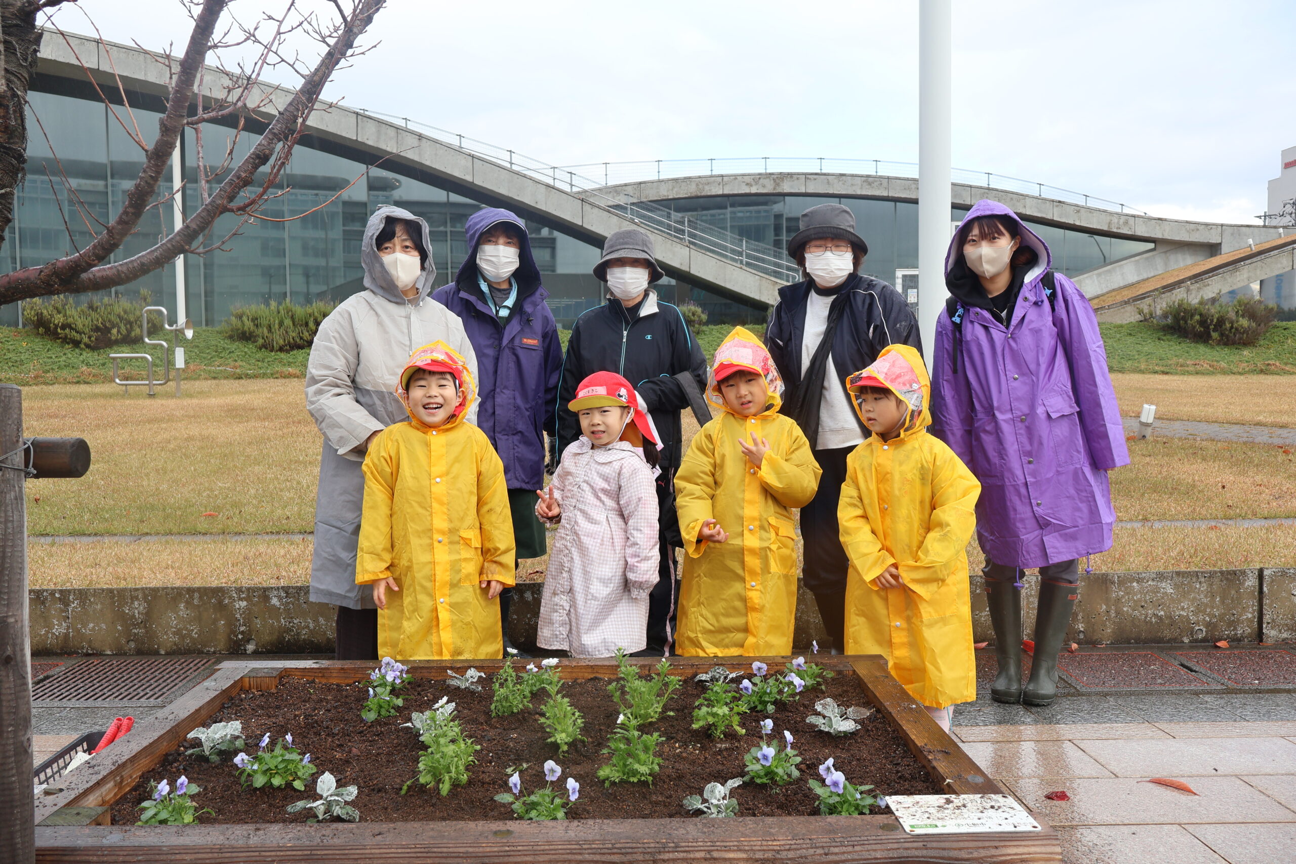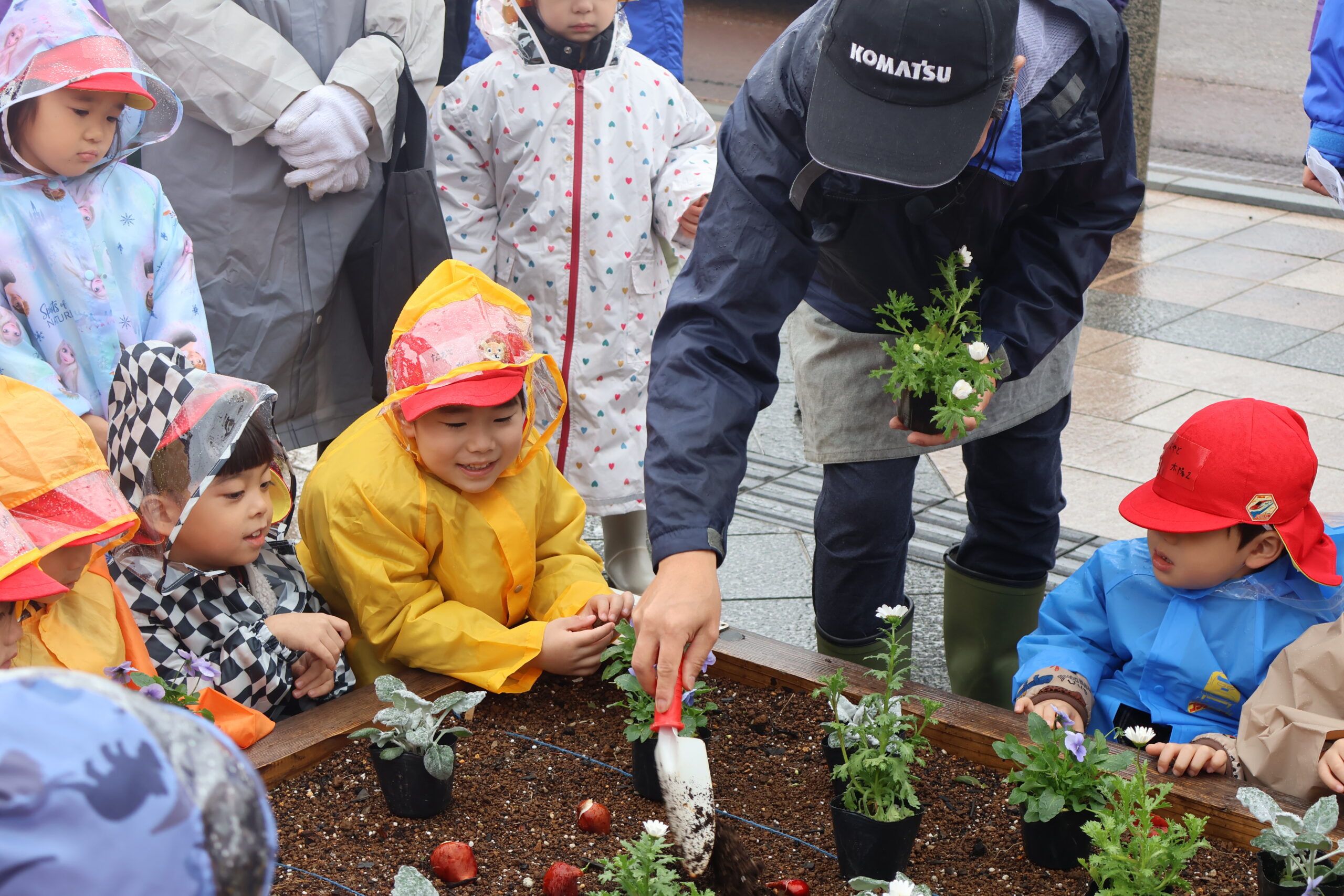 松陽こども園の子供たちと花育活動でサイエンスヒルズ前にあるおもてなし花壇に花と球根を植えました!