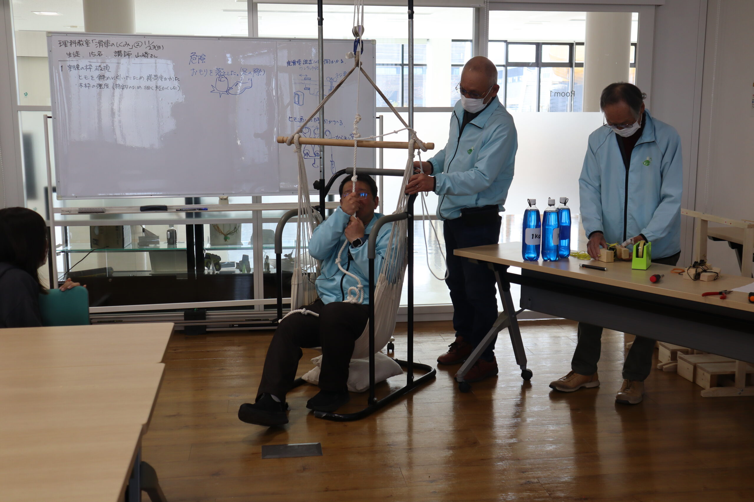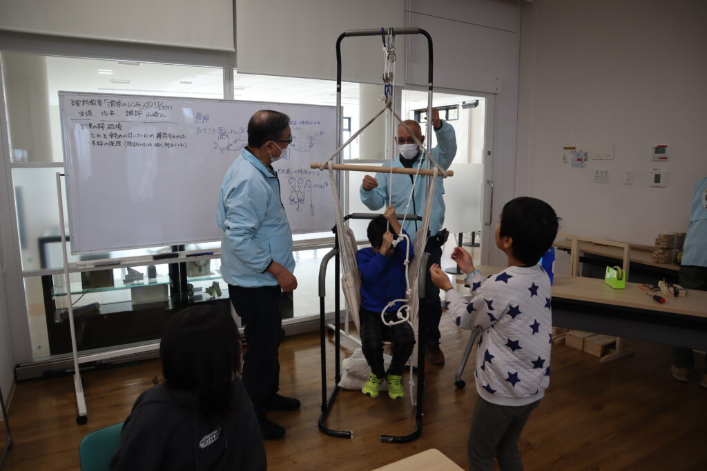 子ども達は自分の体重を軽々持ち上がることに驚いていました。山崎講師も自分でロープを引っぱり軽々持ち上がると子ども達から「おーっ!大人でもできるんやー」という声が上がりました✨