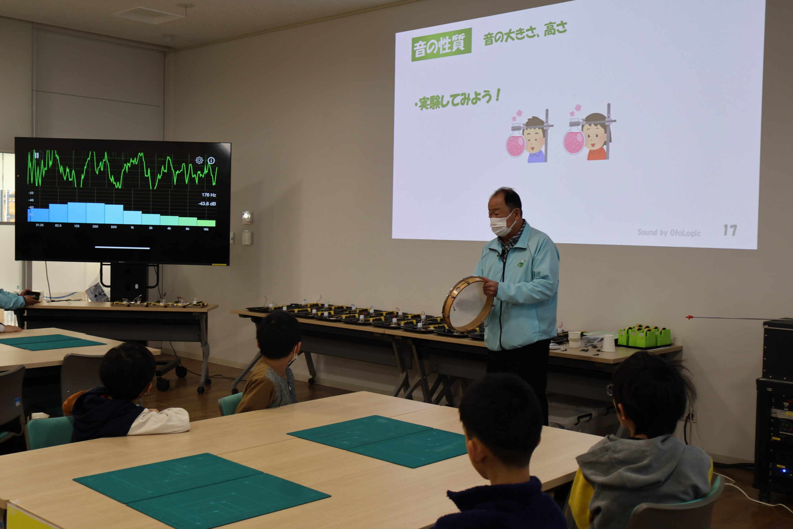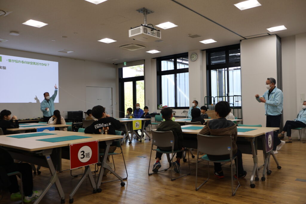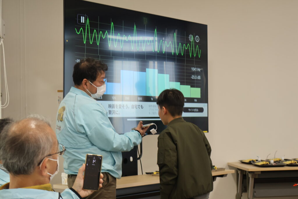 まずは、糸電話や水の波動実験、OBスタッフや保護者の方も含めて何ヘルツまで聞こえるかの実験を行いました。