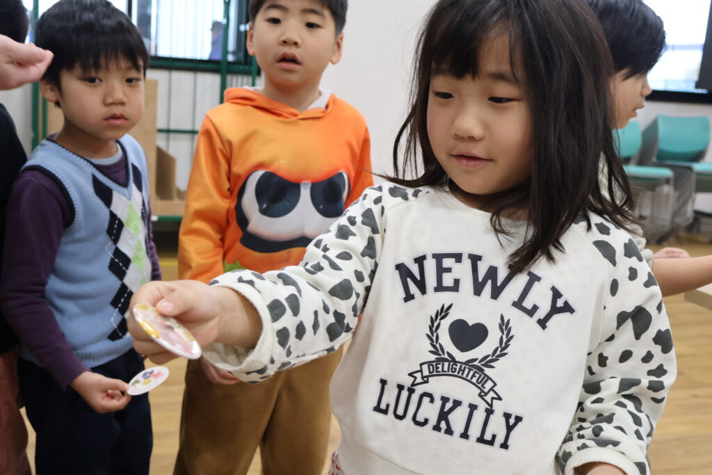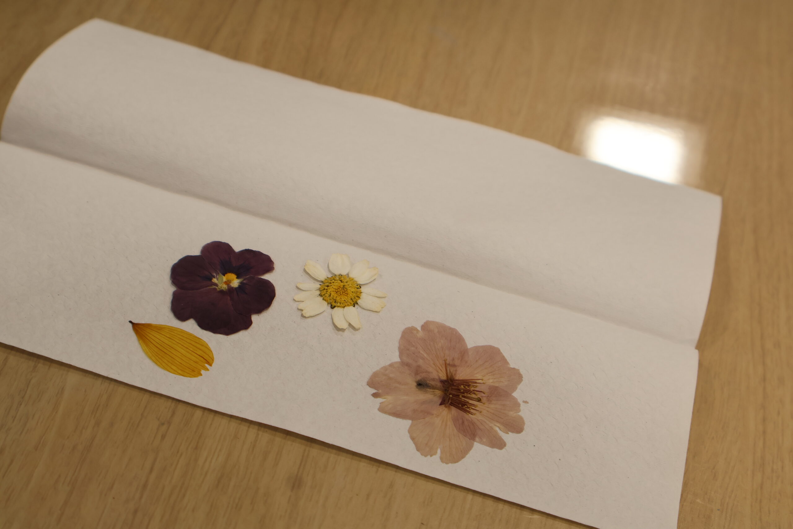 花育活動の1年の活動の締めくくりに、種から育てた花を押し花にしました。そして押し花を利用して缶バッチでコサージュ作りを行いました。このコサージュは卒園式に胸元に飾ることになります。