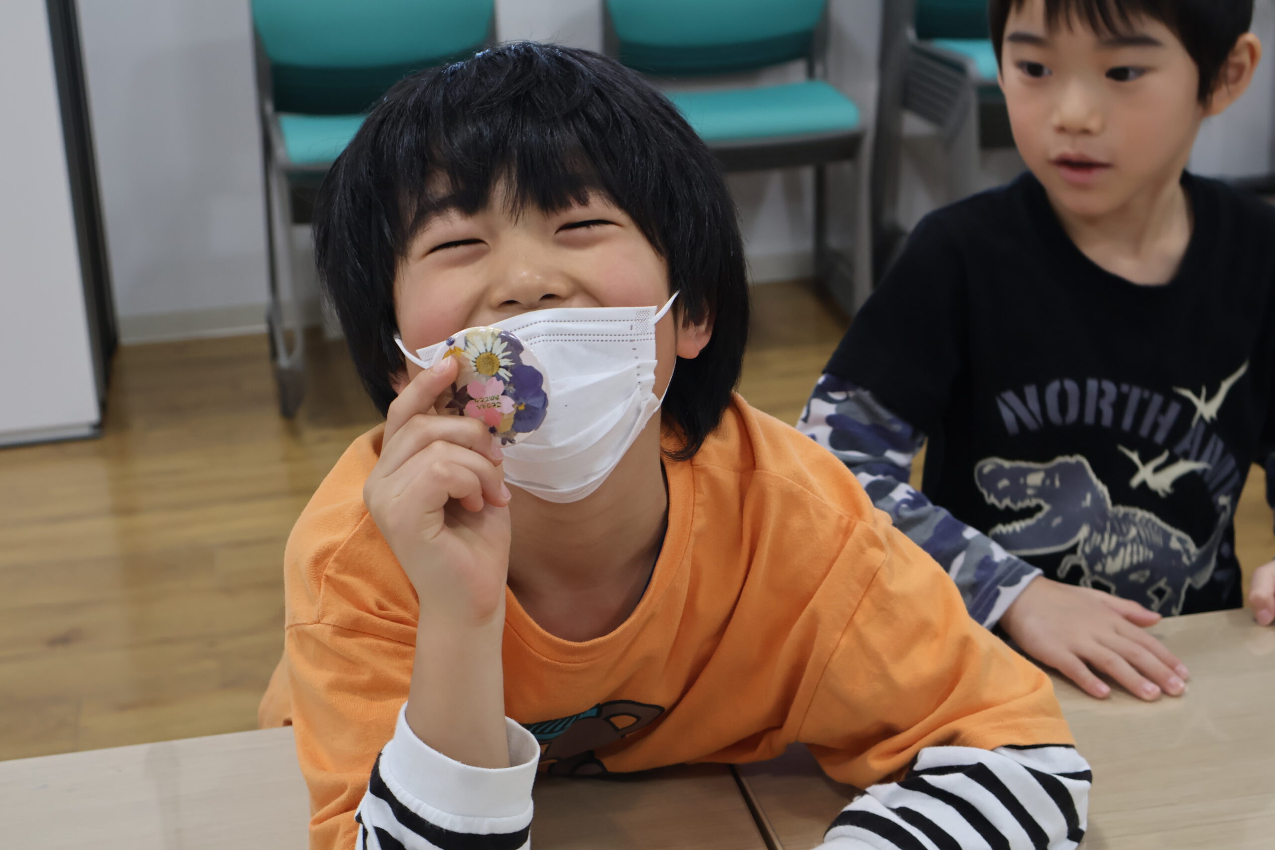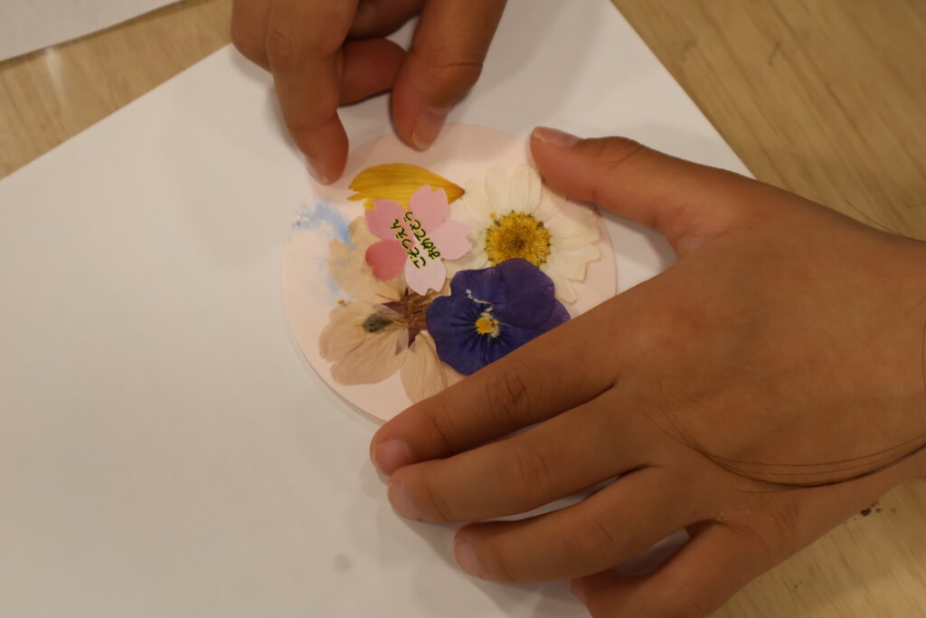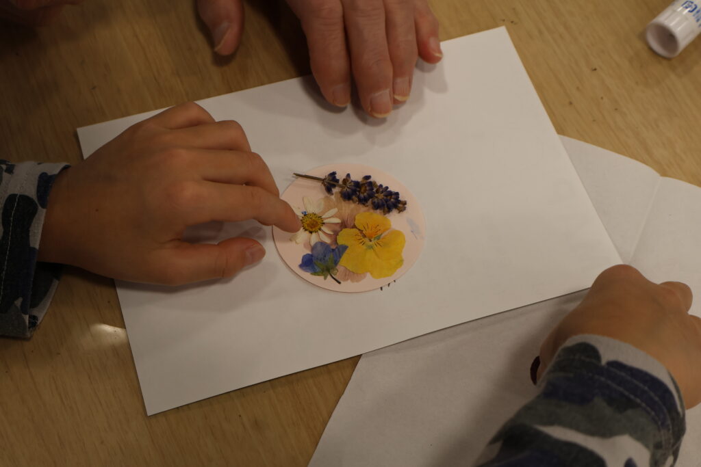 こまつの杜で作った押し花と、園で作った押し花の二種類の押し花をコサージュにしていきます。みんな、ひとつひとつの作業を丁寧に行いました。