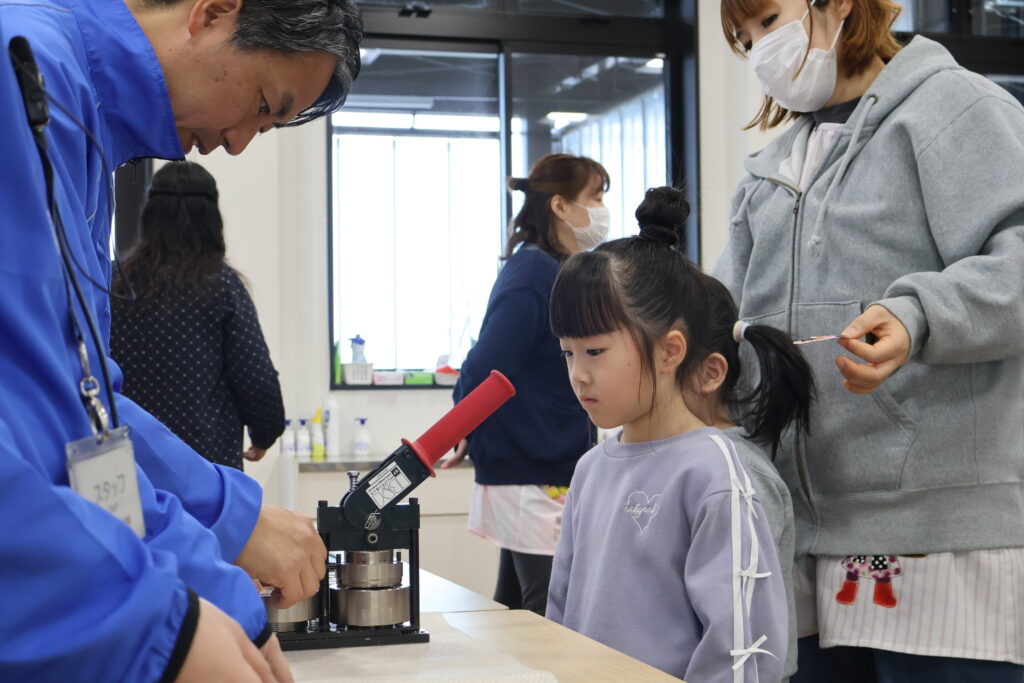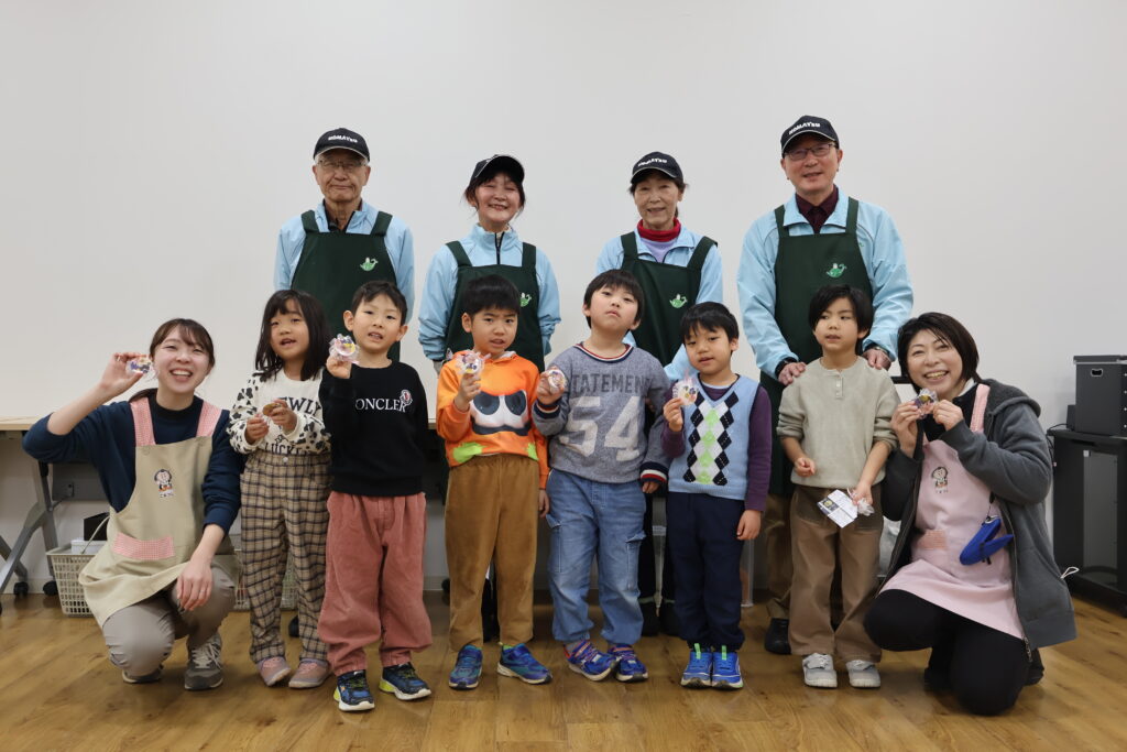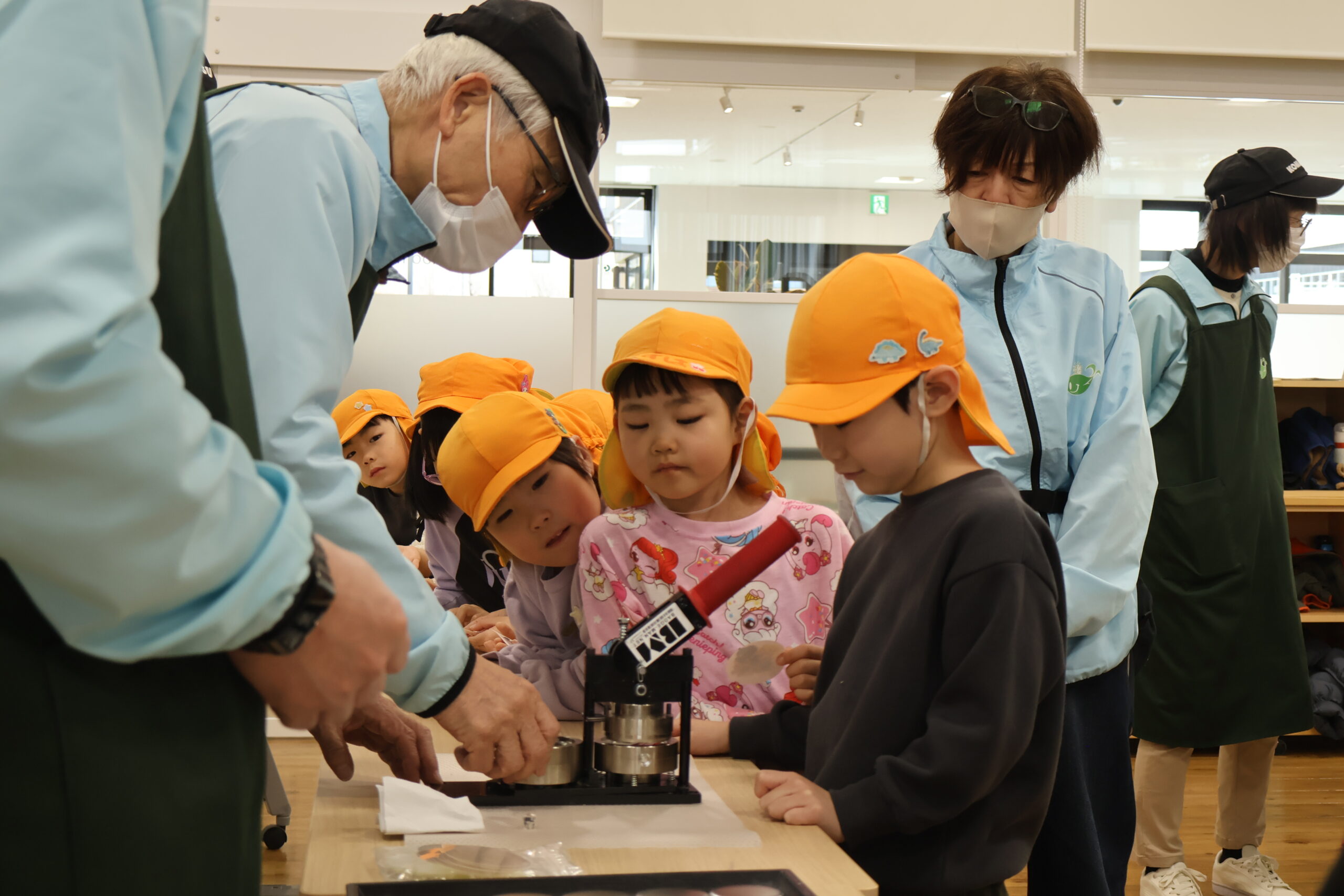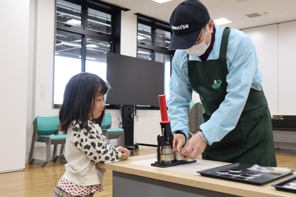 日本花の会の講師・寺井海樹人(てらいみきと)先生とOBボランティアの永田さん・助田さんに缶バッチにしてもらいます。