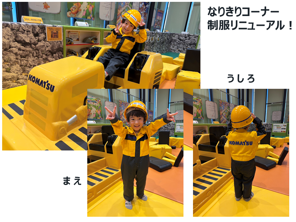 わくわくコマツキッズ館の人気体験「なりきりコーナー」で使用している制服が、このたびリニューアル!