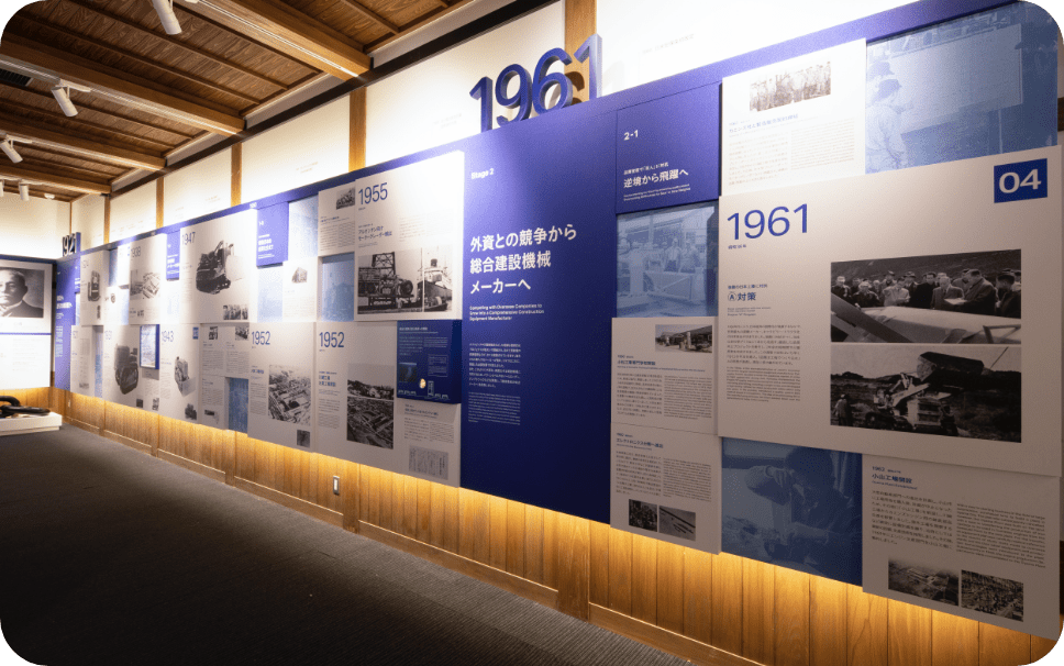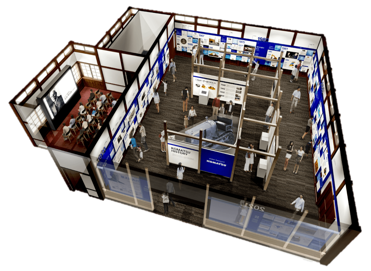 1階は創業期から現在に至る100年の歴史の全体像を紹介する展示とシアターがあり、2階は「コマツウェイ」を紹介する展示と個別の歴史を深堀できる展示となっています。