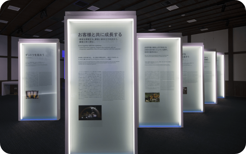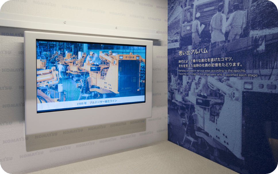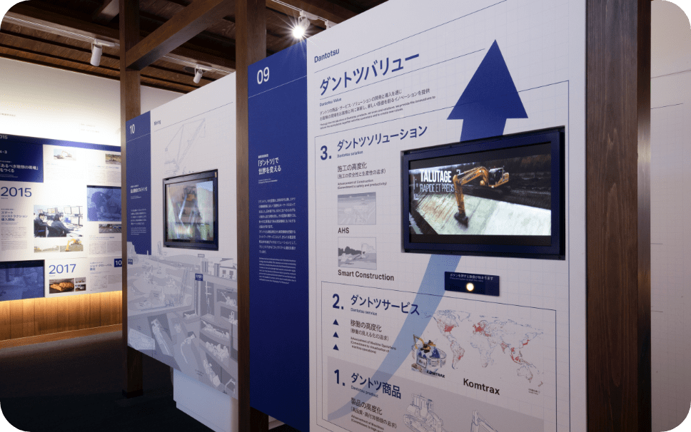 綿々とつながるDNAを「言葉」を通して表現した「コマツウェイ展示」や100年の歴史をさまざまな視点から見ることができる「ヒストリーウォール」「インデックステーブル」があります。