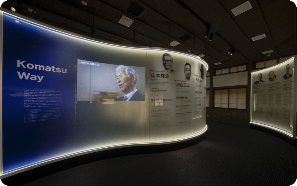 コマツのDNAと呼ぶべき「コマツウェイ」の誕生から、制定に込めた思い、また先人たちが幾多の困難を乗り越えてきた中で大切にしてきた思いを紹介しています。また、コマツウェイ語録とそれにまつわるエピソードを展示しています。