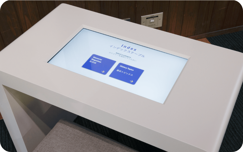商品史、工場史などコンテンツをスクリーンにて年表方式で紹介しています。