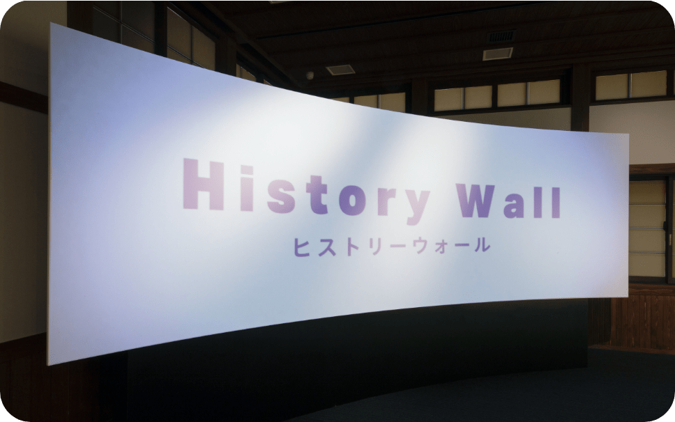 展示室壁面には100年の歩みを年代順に網羅した年表を、展示しています。創業前の前史から、2021年以降の未来ゾーンを含めて大きく6つの時代に分かれています。